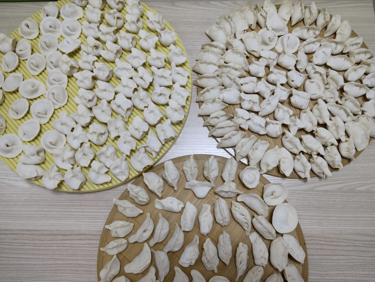 社区干部、党员、志愿者一起和面、拌馅儿、擀皮儿、捣蒜,忙碌却不失条理。大家纷纷拿出看家本领,利索拿皮摊在手心、一步到位填足馅料、飞快捏边迅速包成,像放一件件工艺品一般小心翼翼地摆放到位。包饺子过程有说有笑,一起分享花样饺子包法,互相比着、学着、聊着,不知不觉中一排排一行行满载着希望与祝福的“劳动成果”摆满盘、盛满盒、铺满桌。大家笑盈盈地端起一碗碗幸福饺,一口吃快乐、两口吃健康、三口吃幸福……