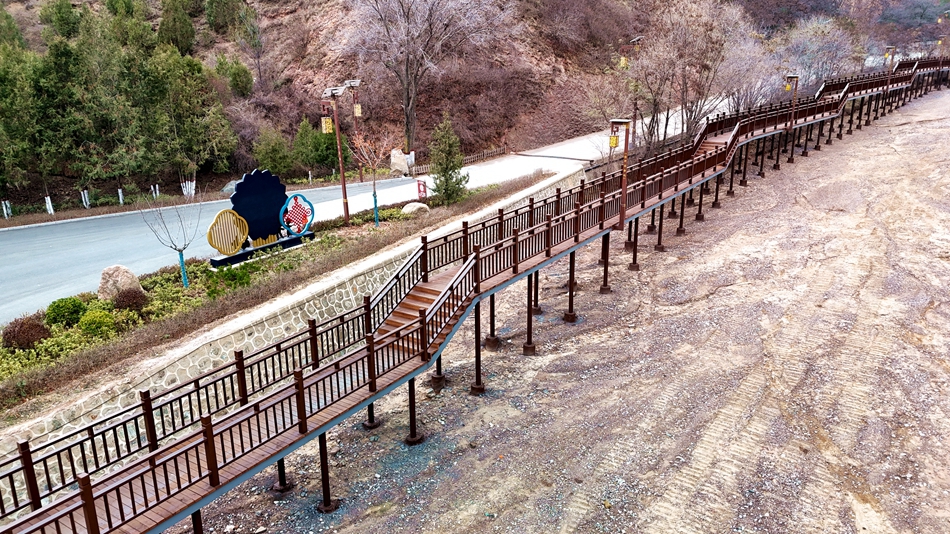 经过三年的建设,水帘洞景区游步道建成,其中人行栈道长1.8公里、宽2米,主体和内侧护栏为镀锌钢结构,步道面板和外侧护栏为防腐木结构,配套山体碎石防护网8段1550米。