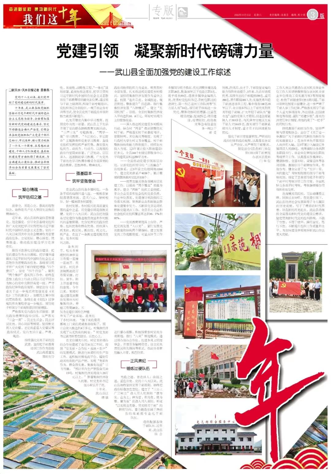 十年来,武山县各级党组织坚持以习近平新时代中国特色社会主义思想为指导,全面贯彻落实新时代党的建设总要求,坚定不移推进全面从严治党,引领全县各级党组织和广大党员干部不忘初心、牢记使命,凝心聚力战胜了一个又一个困难,在思想政治建设、干部人才队伍建设、基层组织建设等方面取得了新成效,为全面建成小康社会、推动全县经济社会高质量发展奠定了坚实基础。