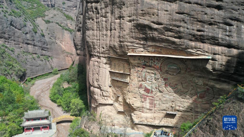 这是4月28日拍摄的拉梢寺露天摩崖浮雕造像(无人机照片)。新华社记者 陈斌 摄