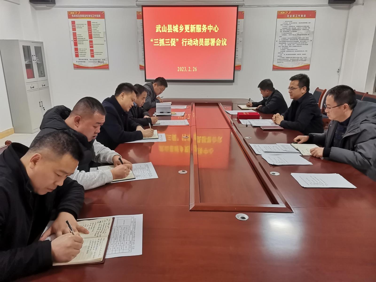 一是加强组织领导,精心谋划部署。全县“三抓三促”行动部署会议召开后,县城乡更新服务中心党组高度重视、迅速行动,第一时间召开动员部署会议,传达学习省市县委部署会议精神,成立由中心党组书记任组长、班子成员任副组长、各股室负责人为成员的“三抓三促”行动领导小组。领导小组下设办公室,具体负责“行动”日常事务。明确了“三抓三促”行动负责人和联络员,专抓具体工作。结合城乡更新工作实际情况,制定印发了《武山县城乡更新服务中心“抓学习促提升抓执行促落实抓效能促发展”行动方案》,明确主要任务、工作措施和步骤安排,把工作任务细化到每一个工作时段,量化到每一个环节,具体到每一个岗位,为全面推进“三抓三促”行动提供强有力的组织保障。