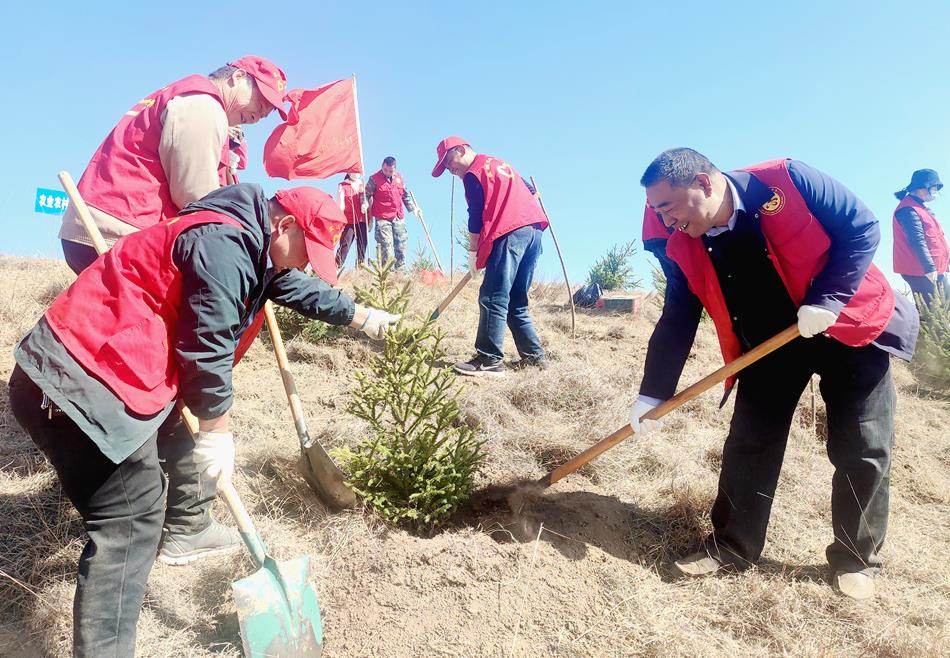 在义务植树点,大家分工协作,干劲十足。有的挥锹铲土、有的扶苗栽树、有的填土踩实,三五人一组默契配合,认真细致完成着每一道工序,呈现出一派热火朝天的植树现场。经过一下午的辛勤劳动,1000多棵新种植的云杉、洋槐形成了一道春意盎然的绿色风景线,在春风中展现着勃勃生机。