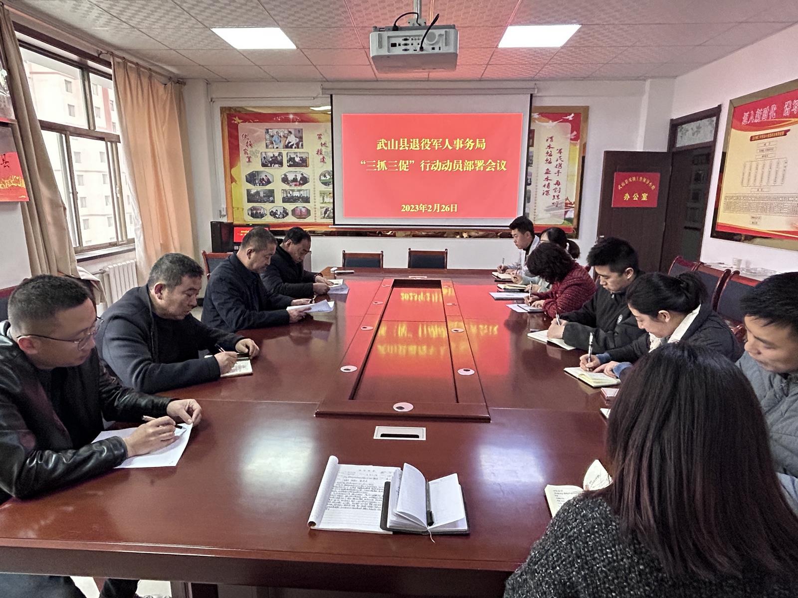 2月26日,县退役军人事务局召开了“三抓三促”行动动员部署会议,传达学习了全县“三抓三促”行动动员部署会议精神,讨论审议了《武山县退役军人事务局“抓学习促提升抓执行促落实抓效能促发展”行动实施方案》,并结合单位实际,就如何开展“三抓三促行动”进行了动员部署。
