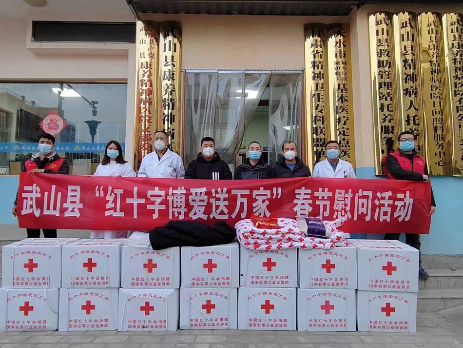 春节将至,温暖前行。为深入贯彻落实党的二十大精神,大力弘扬“人道、博爱、奉献”的红十字精神,彰显党和政府对孤残人士的关爱,在新春佳节来临之际,武山县红十字会积极组织开展“红十字博爱送万家”活动,2023年1月18日,县卫健局党组成员朱胜钦、红十字会副会长陈琦一行深入武山县康养精神病医院看望慰问医护人员和患者,把党和政府的关怀和温暖传递给特殊困难人群。