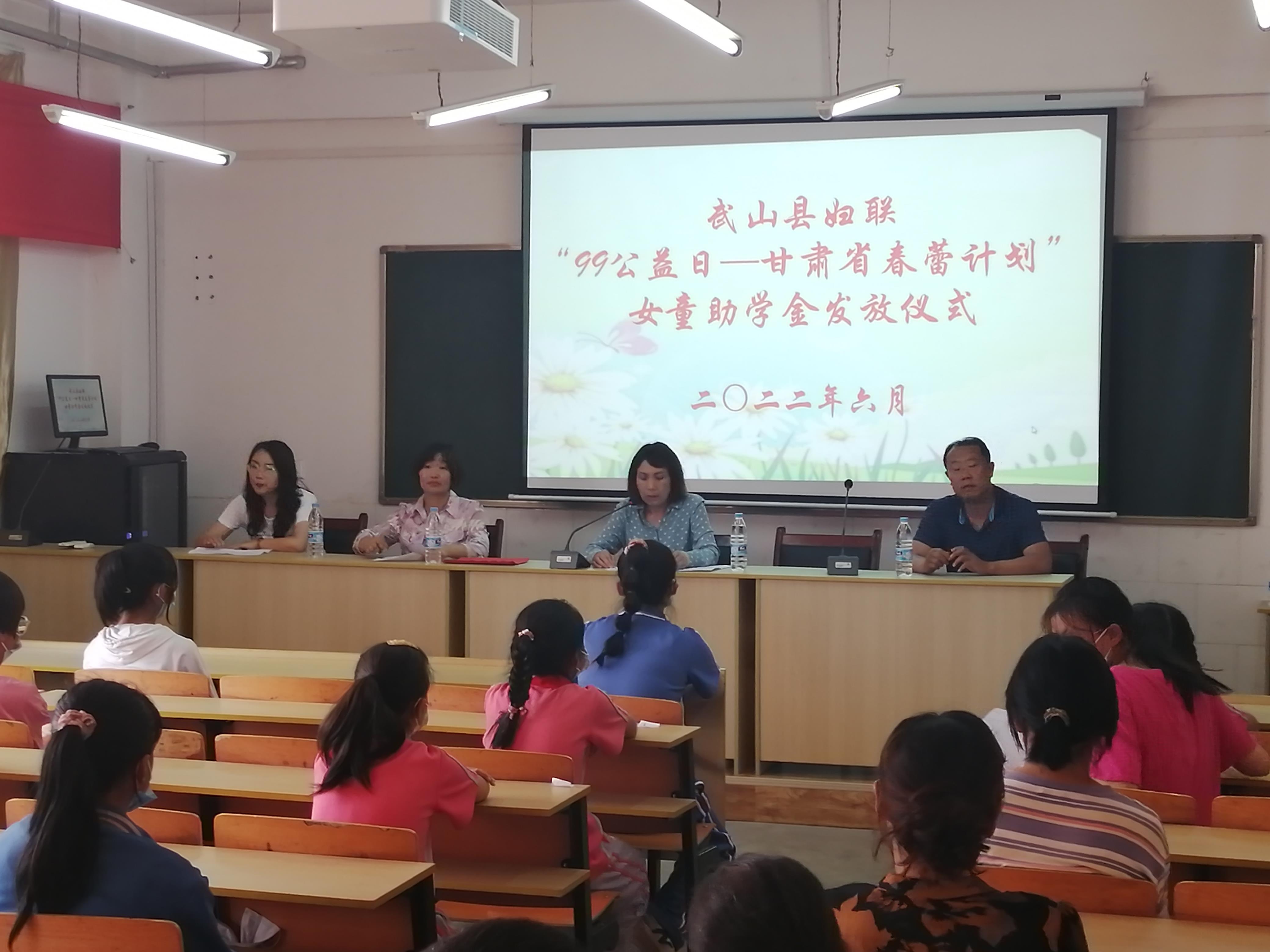 爱心浇灌春蕾,真情播撒希望。为进一步营造全社会关心关爱女童的良好氛围,帮助更多品学兼优的困境女童完成学业,实现梦想。6月21日,武山县妇联在山丹初中举行“99公益——甘肃省春蕾计划”助学金发放仪式。县妇联主席李梦琦、县妇联副主席霍文娟,山丹镇相关负责人,受助学校相关负责人,受助学生和家长共计50多人参加发放仪式。
