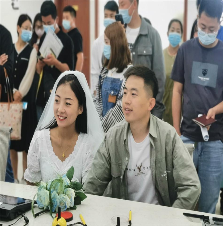 5月20日一早,在武山县民政局婚姻登记中心外,一对对准新人们脸上洋溢着喜悦的笑容,准新人们在工作人员的引导下领取进场顺序号,有序登记、领证。