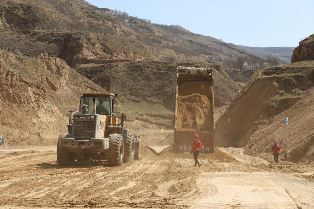 (乘家沟新建淤地坝施工现场一派热火朝天的繁忙景象)
