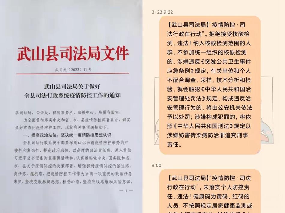 三是强化普法宣传,舆论引导到位。充分发挥普法职能作用,加大疫情防控法治宣传工作,扎实开展了“防控疫情、法治同行”法治宣传活动。充分利用 “武山司法”微信公众号、普法微信群等多种方式,对《中华人民共和国传染病防治法》《突发公共卫生事件应急条例》等法律法规开展重点宣传,及时普及疫情防控特殊时期公众生活常识和法律知识。各司法所结合“法律进校园”、“法律进乡村” 及“法律明白人”培训活动,开展了《民法典》等法律法规的学习宣传和疫情防控知识讲解。截至目前,发送疫情普法短信2978条,开展法治宣传32场次,通过精准法治宣传,有效提高了群众依法防疫意识,为打赢疫情防控阻击战营造良好法治环境。