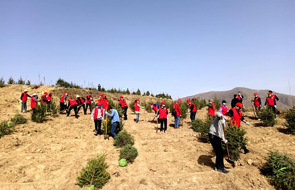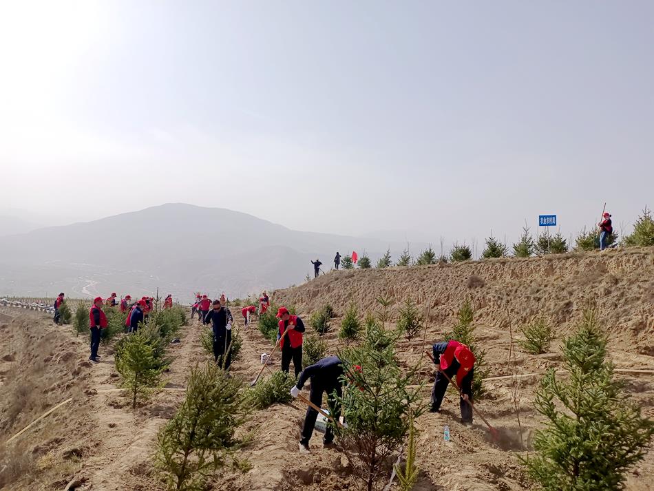 植树现场,大家以饱满的热情投入到播种绿色的行动中,挥锹铲土、挖土回填、浇水植树,一片忙碌景象,经过一下午的辛勤劳动,1000多棵新种植的云杉、刺槐在春风中展现着勃勃生机。