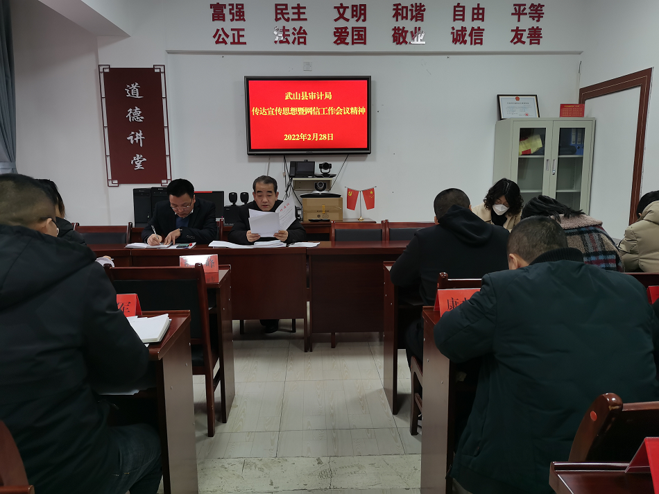 2022年2月28日,审计局传达学习全县宣传思想暨网信工作会议精神,会上学习了全国宣传部长会议、网信办主任会议以及全省宣传部长会议、网信工作会议和全市宣传思想工作会议精神,分析研判形势,安排部署局机关宣传思想和网信重点工作,进一步动员全局上下坚定信心、主动作为,唱响主旋律,传播正能量,为全年工作提供坚强思想保证和强大精神力量。局党组书记、局长付新全主持会议,全体干部职工参加会议。