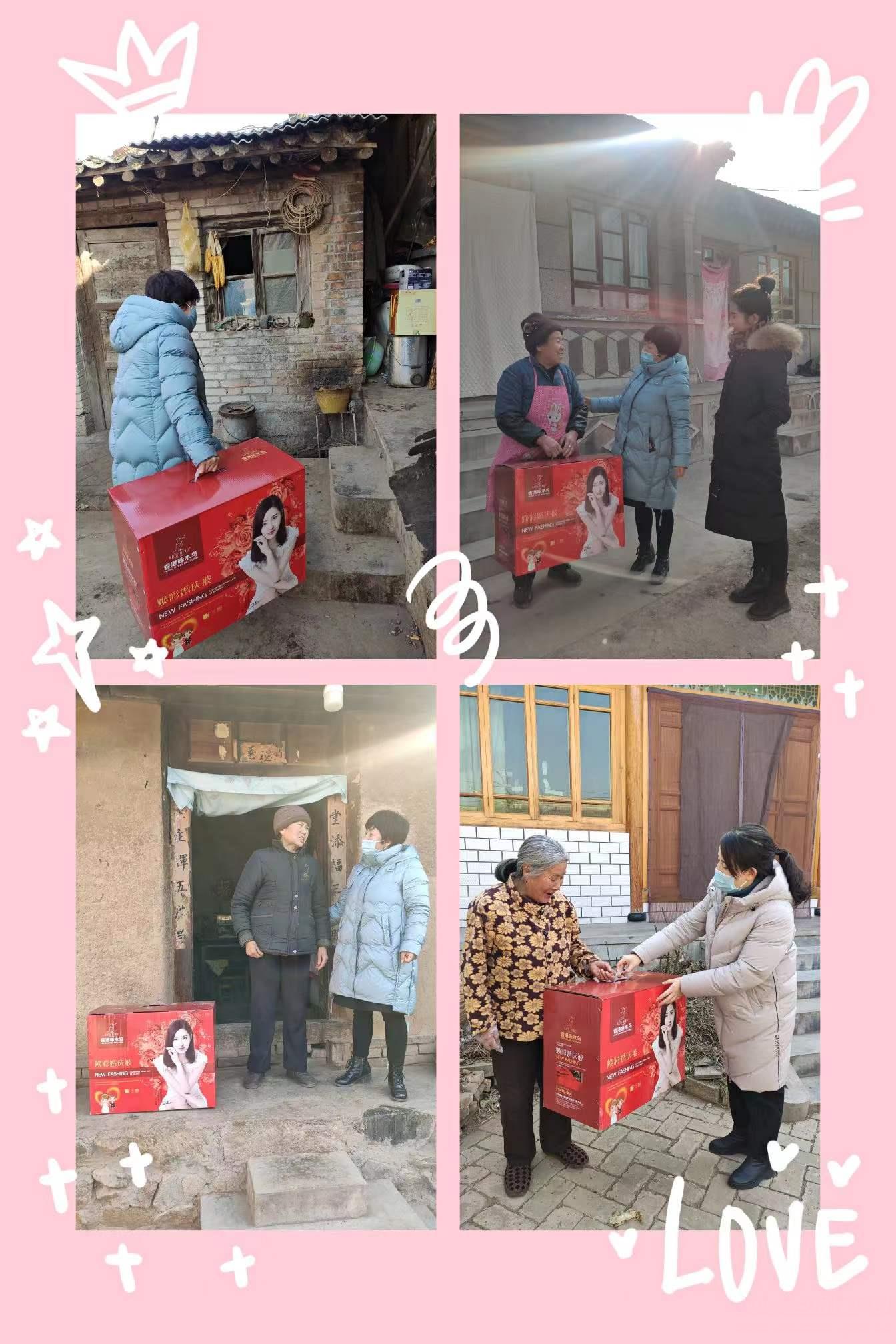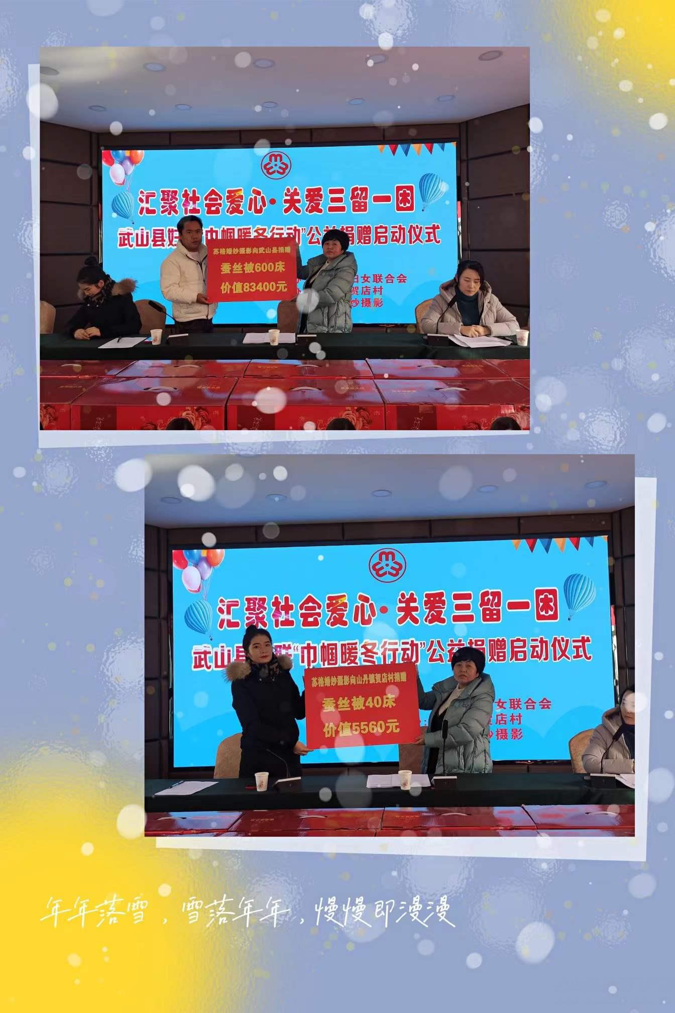 启动仪式上,苏格婚纱摄影公司为全县困境老人及妇女儿童捐赠价值 83400元的蚕丝被600床,县妇联副主席接收捐赠。同时,现场为山丹镇贺店村贫困妇女捐赠发放价值5560元的蚕丝被40床。