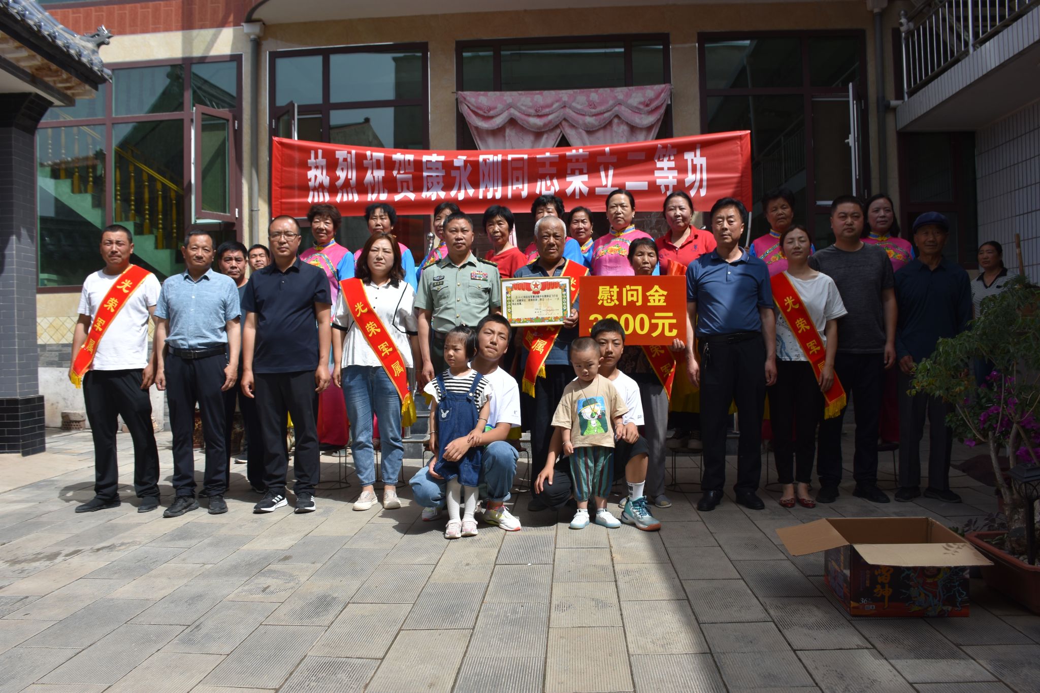 梁兴卫一行在锣鼓声和载歌载舞的热烈氛围中,将康永刚二等功喜报送到其家中,并为其家属披绶带,送去慰问奖励金。随后与他们亲切交谈,详细了解他们的生活状况,感谢他们为祖国、为人民军队培养出如此优秀的人才,为家乡赢得了荣誉,为国防事业添砖加瓦。家属表示,作为军属感到十分的光荣,感谢祖国,感谢部队,为孩子提供这么好的平台,他们将一如既往地做好孩子坚强后盾,让孩子安心服役,争取再立新功、再为家乡增光。
