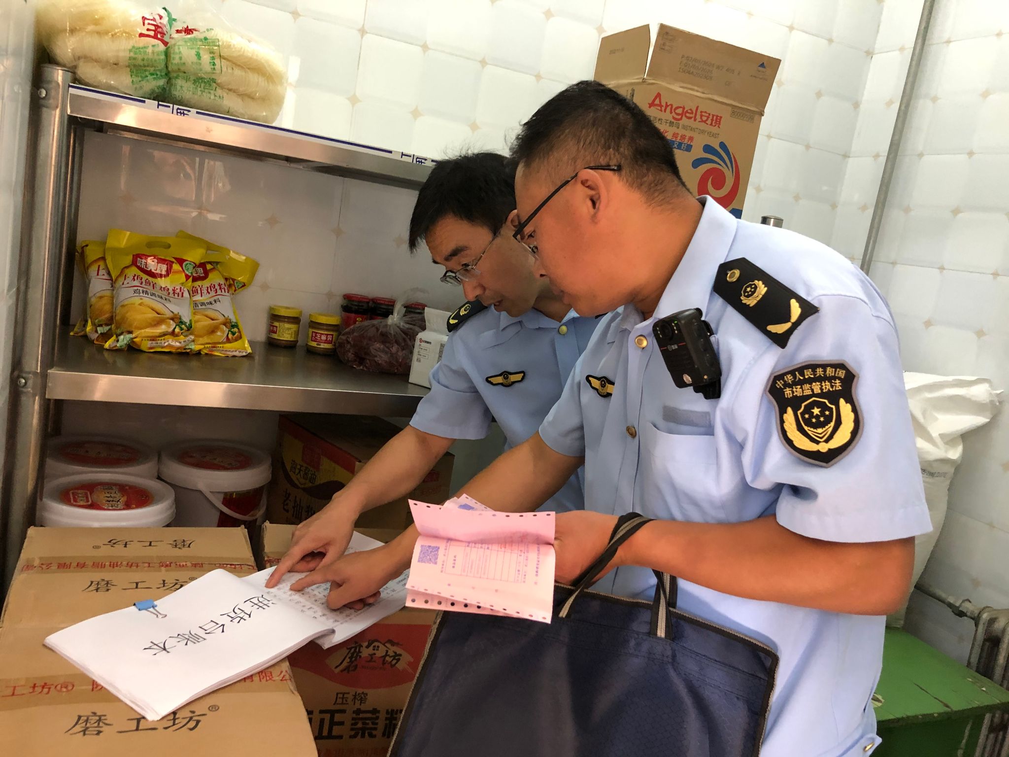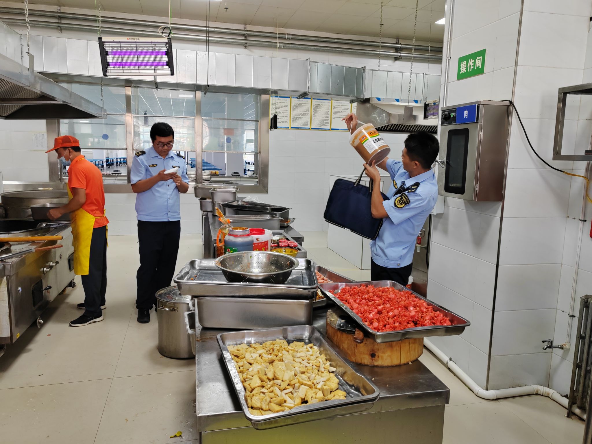 二是严把食品原材料进购关。执法人员仔细查验食品原辅料,看食品原料包装及生产厂商资质是否正规合法,索证索票是否来源可溯、去向可查、流向可控,查验食品生产日期及有效期是否票据一致,要求学校食堂严格落实进货查验及索证索票制度,严把食材关口,保证所加工制作食品的质量安全,不得使用来源不明的家禽家畜肉,从业人员工作期间要穿戴干净整洁的衣帽口罩;加工食品要做到生熟分开、荤素分开、烧熟煮透,防止交叉感染。