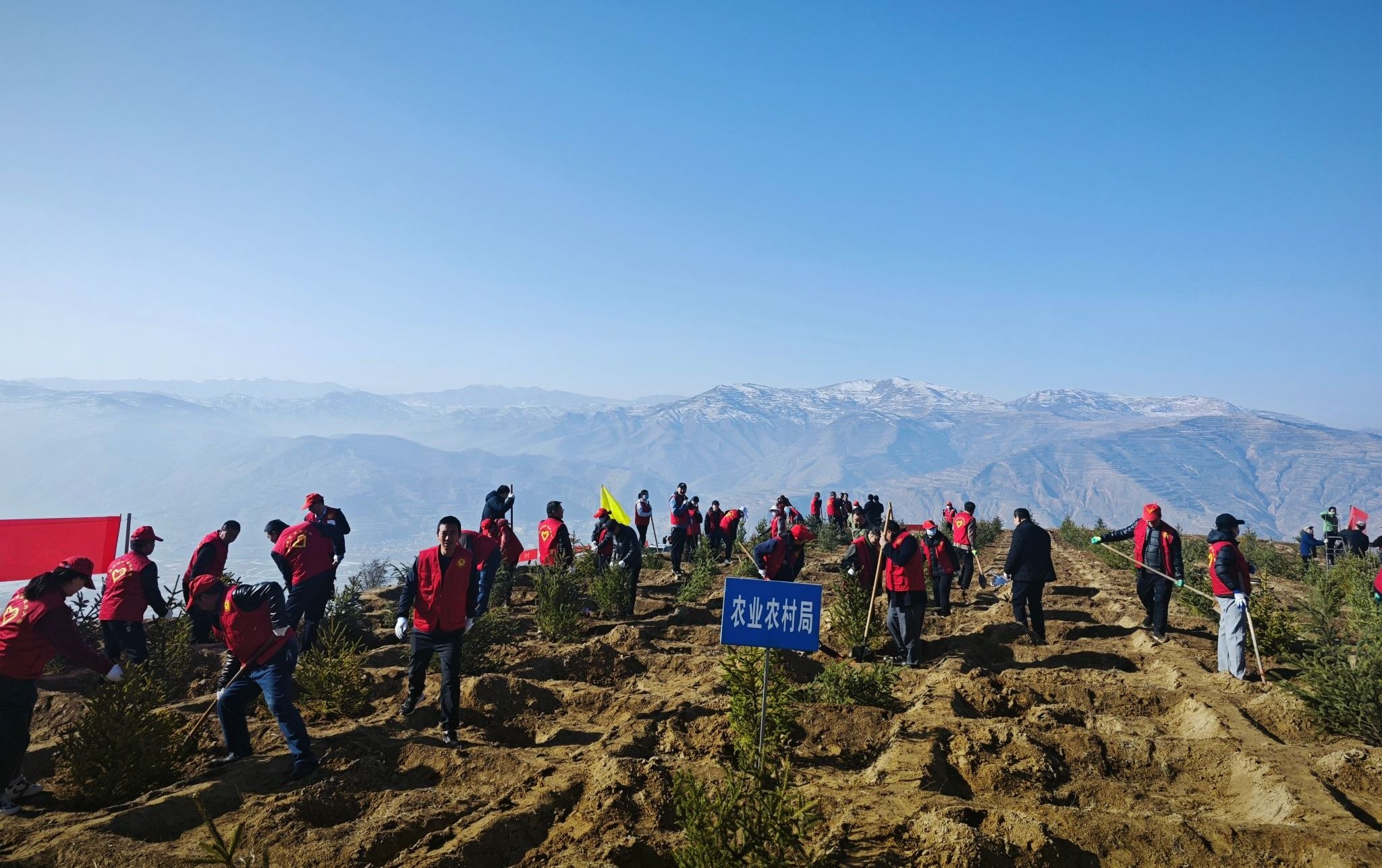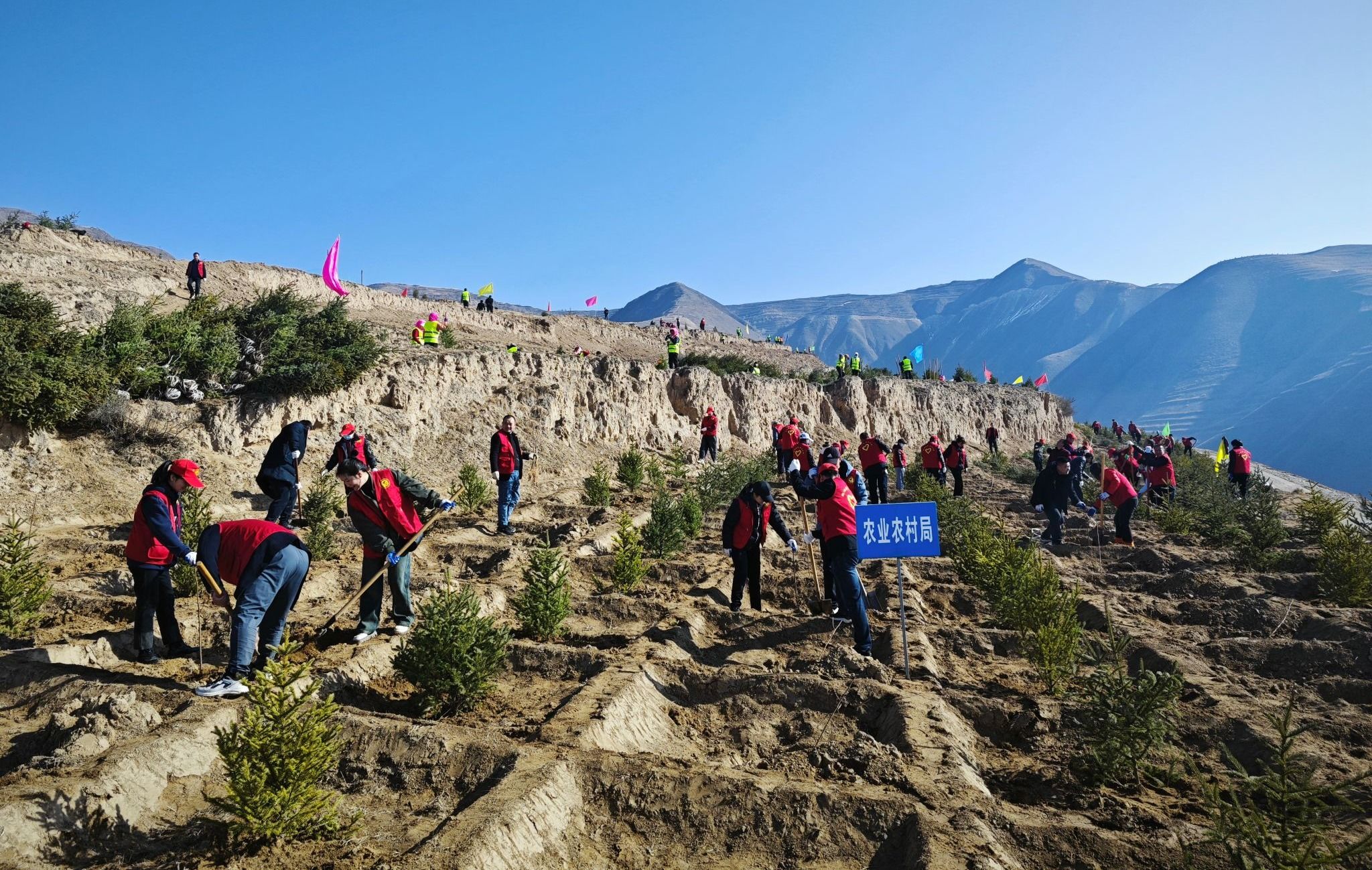 春风添新绿,植树正当时。3月11日上午,武山县农业农村局组织干部职工到盘龙山义务植树基地开展义务植树活动,为“十有”武山增添一抹新绿。在义务植树现场,大家统一着“一爱一为”志愿服,团结协作,热情高涨,干劲十足,严格按照保护根系、深栽踏实、扶正苗木等有关技术标准和要求,进行搬苗、扶苗、填土,每一道工序都认真细致、衔接有序,呈现出一派热火朝天的劳动场面,成为春天一道靓丽的风景线。通过大家的努力,一排排云杉和刺槐迎风而立,整个山坡披上绿装、焕然一新。