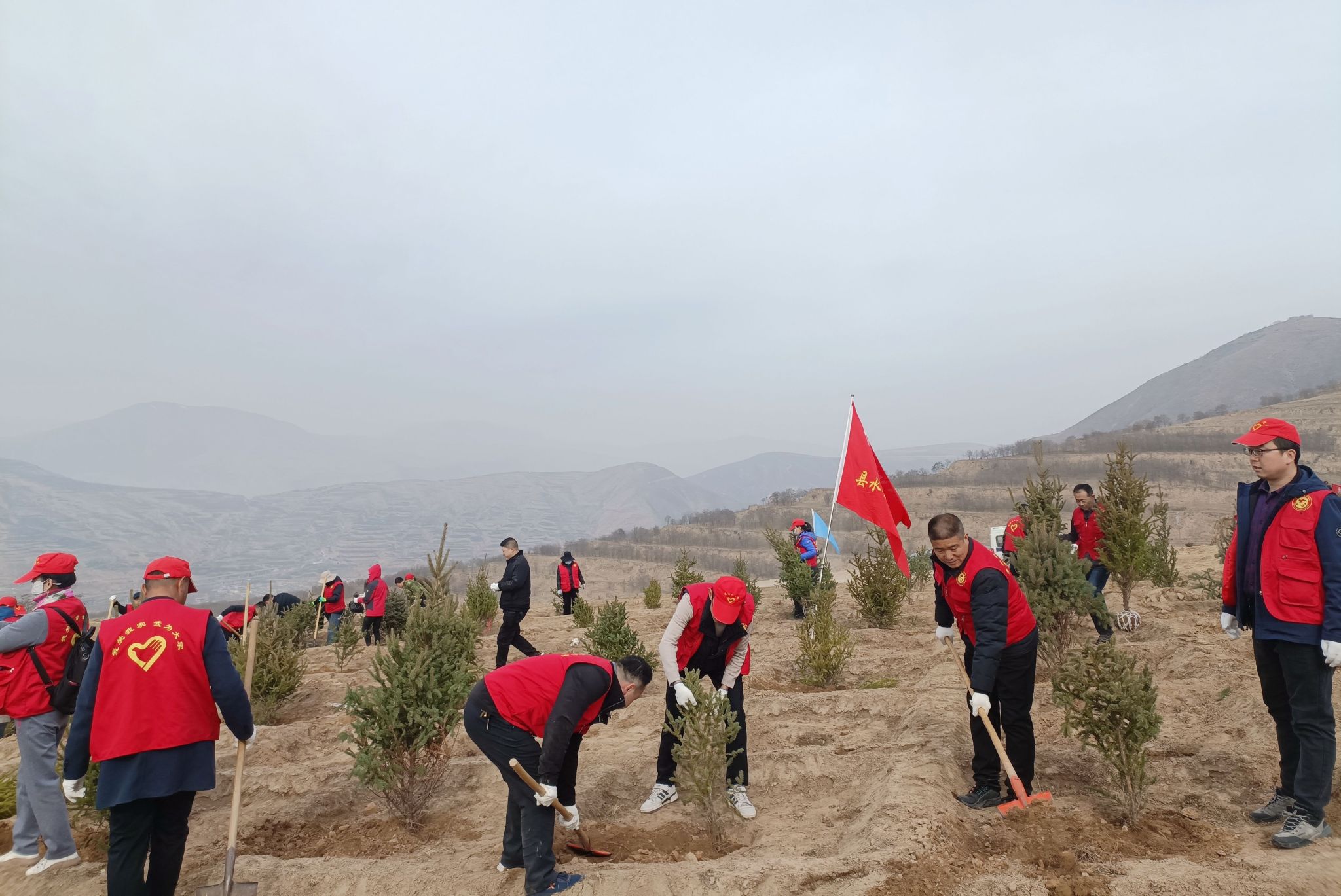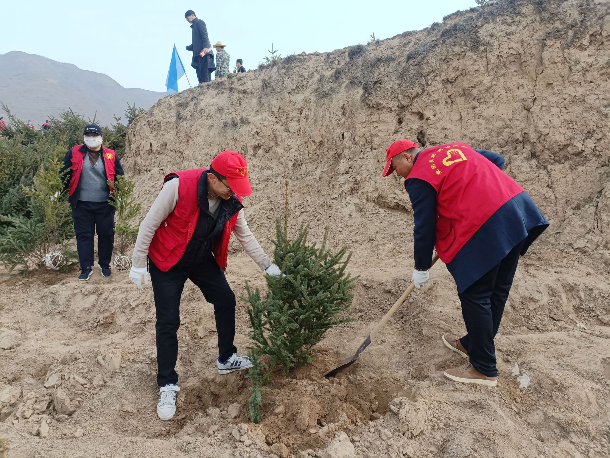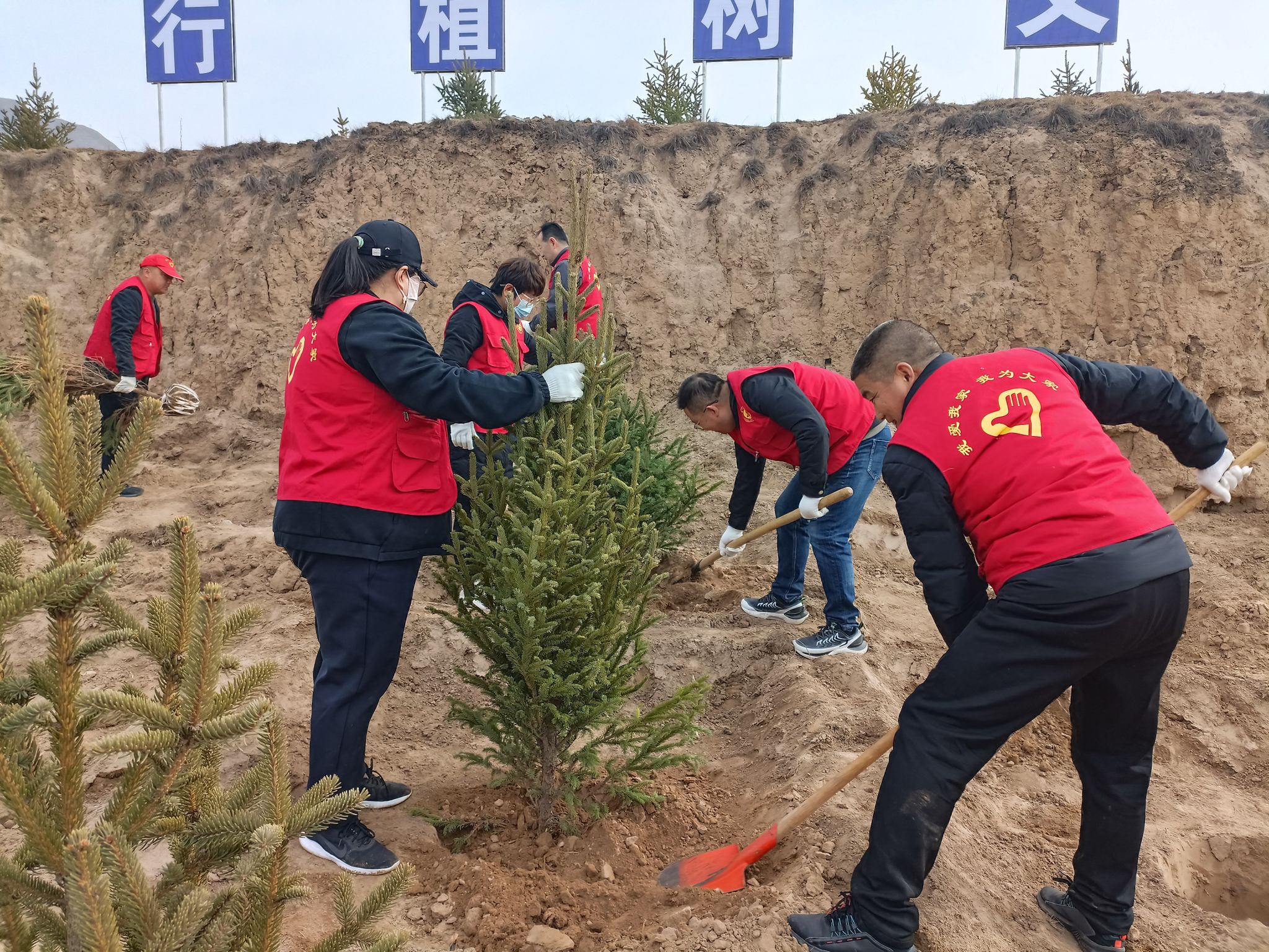 活动现场,身穿“红马甲”的水保志愿者们分工协作、配合默契,有的挥锹挖坑、有的扶苗填土、有的围堰浇水,个个热情高涨、干劲十足,现场一片热火朝天的劳动景象。忙碌过后,300余株种好的云杉和红叶李迎风而立,在明媚的阳光中展现勃勃生机。