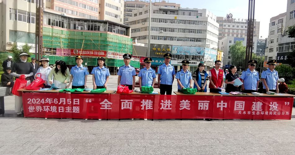 为深入宣传贯彻习近平生态文明思想,引导全社会牢固树立和践行绿水青山就是金山银山的理念,进一步提高人民群众生态环境保护意识,大力营造六·五环境日的宣传氛围,6月5日,武山县组织县生态环境保护委员会成员单位代表,南关社区代表、武山中荷环境管理有限公司代表和其他社会各界代表共计100多人在宁远广场开展了以“全面建设美丽中国”为主题的第53个世界环境日宣传活动。