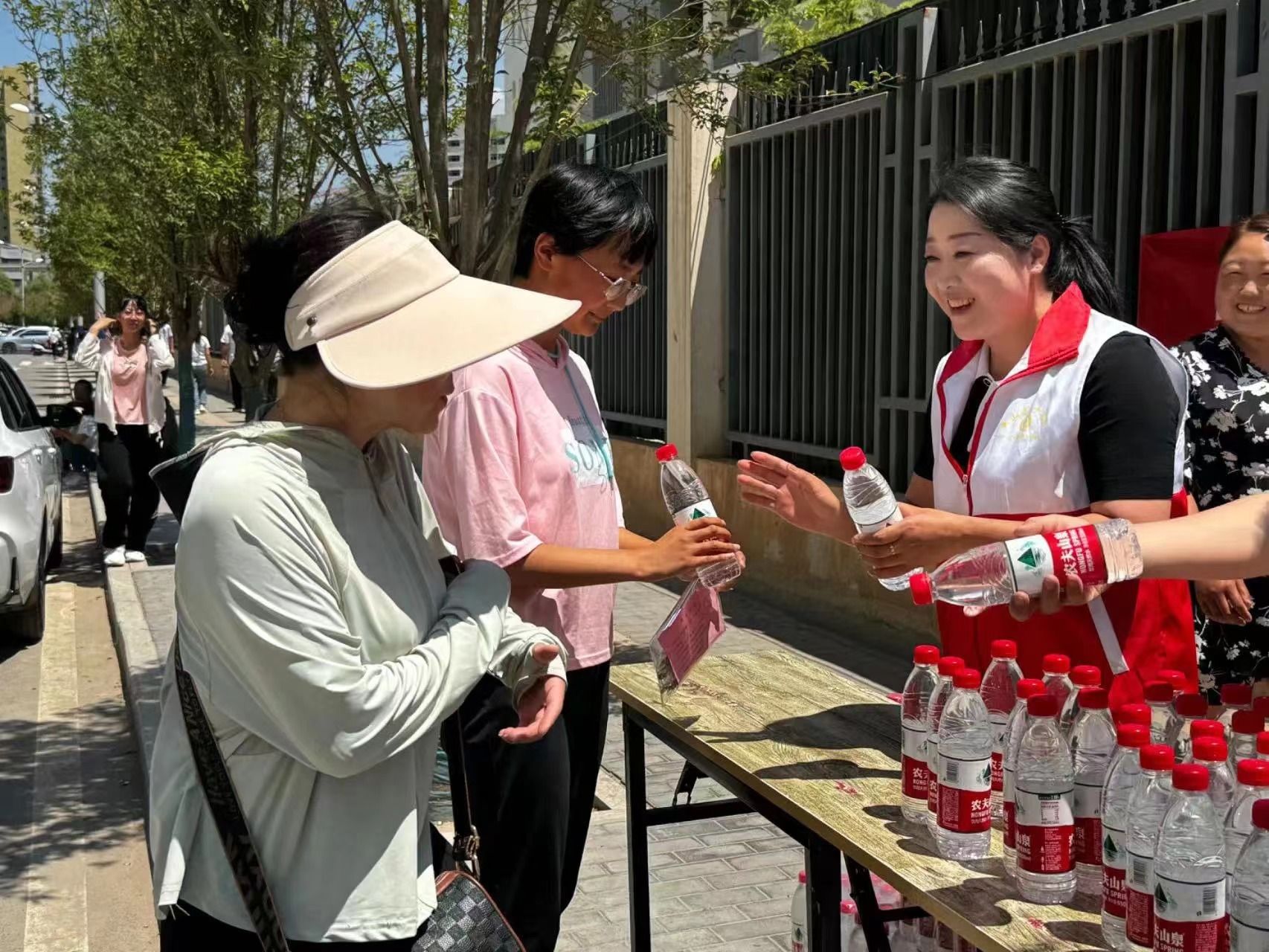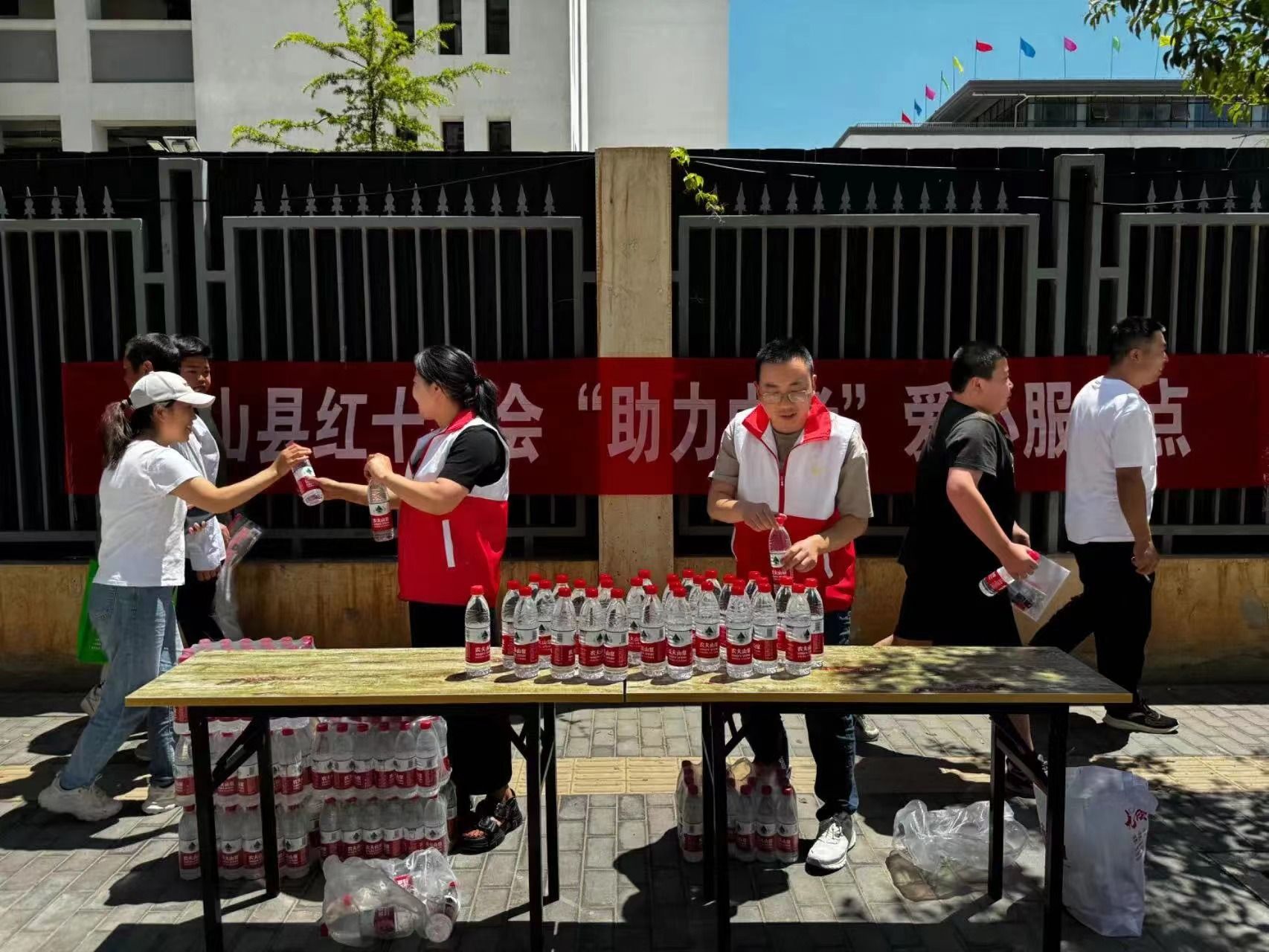 在炎热的夏日,县红十字会志愿者们在考点附近设立了“爱心服务点”,为广大考生和家长们免费分发矿泉水,为他们消暑解渴,和考生们亲切交谈,帮助他们疏导心理压力,鼓励他们以更加积极的心态迎接考试。同时,还积极协助交警维持考点外秩序,为考生营造安静、舒适、良好的考试环境。