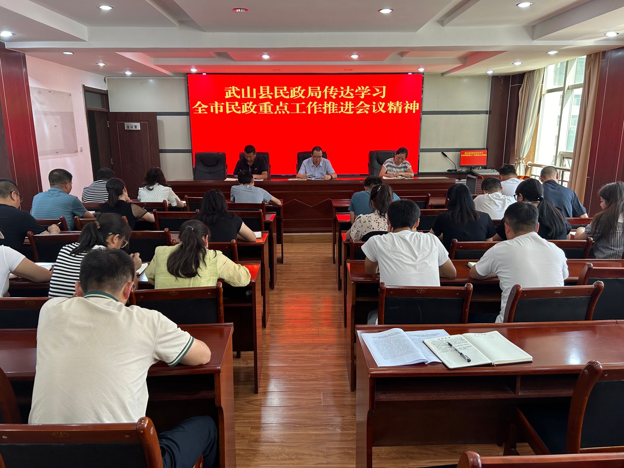 8月19日,武山县民政局召开专题会议,传达学习全市民政重点工作推进会议精神。局领导班子成员、全体干部职工参加会议。