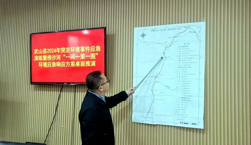 演练采用“场景模拟+桌面推演”模式,模拟武山县马力镇余寨村桥发生柴油运输车辆侧翻事故,导致驾驶员受伤昏迷,装载油品泄漏并进入榜沙河,污染物正在向下游移,可能引发较大突发环境事件。接到险情报告后,武山县第一时间启动突发环境事件应急预案和《榜沙河(天水段)“一河一策一图”环境应急响应方案》,快速响应、协同处置、妥善应对突发环境事件。