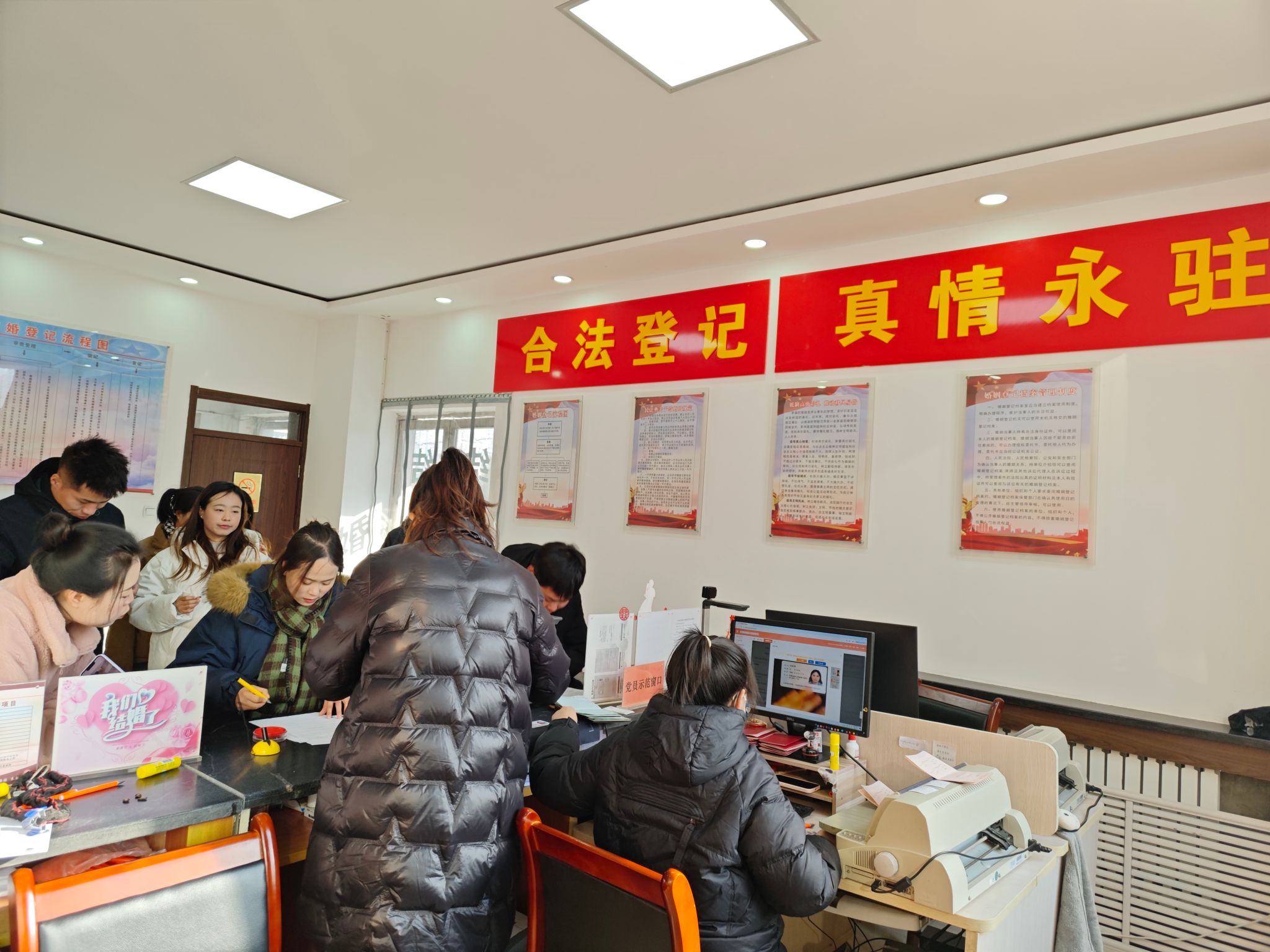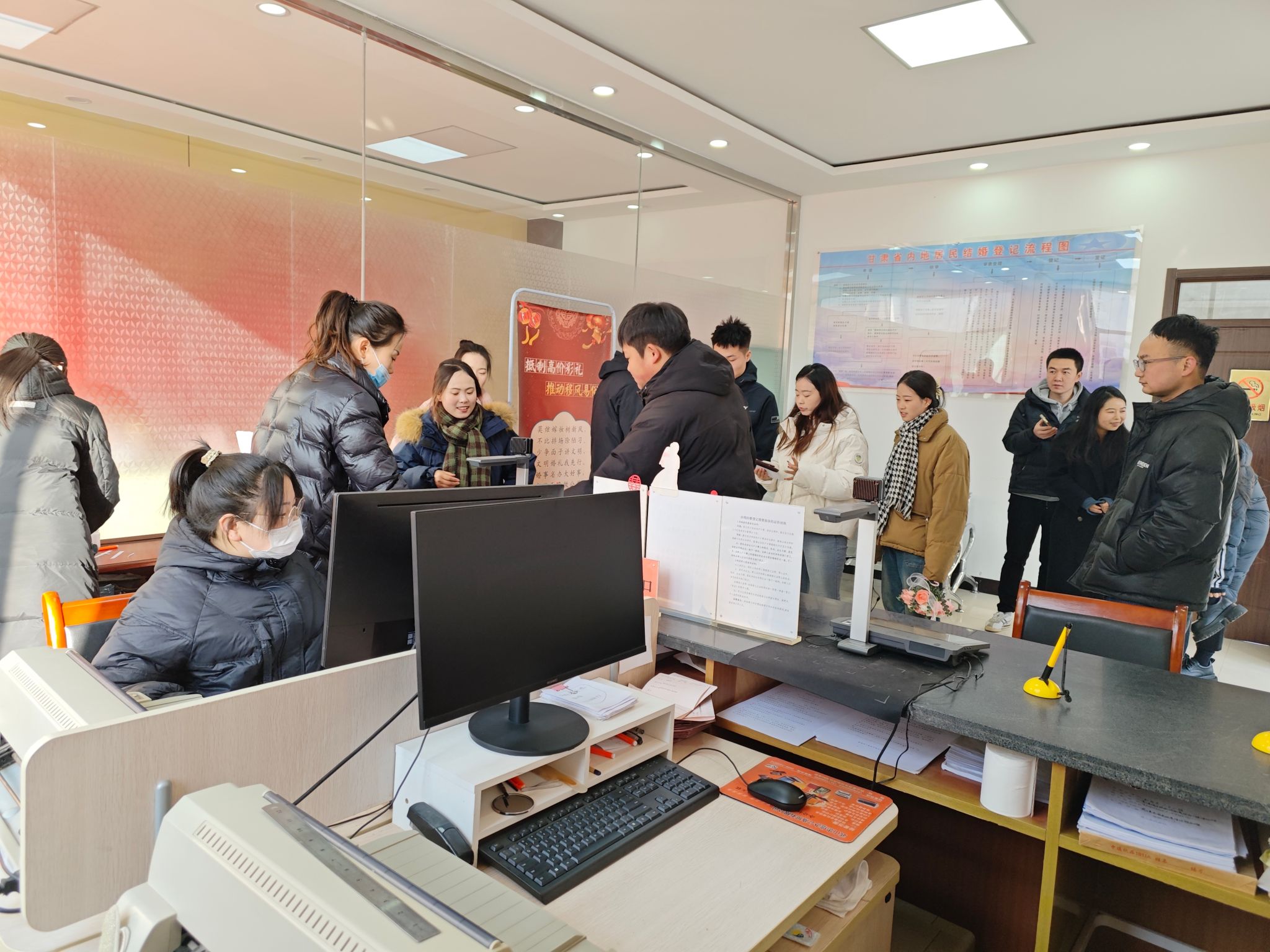 为进一步优化婚姻登记服务,满足群众多样化、个性化办事需求,不断提升便民利民服务质效,武山县民政局婚姻登记中心工作人员早安排、早部署,提前开展预约宣传、设备调试、场景布置等工作,以专业高效优质的服务,全力保障元旦当天婚姻登记工作有序开展。