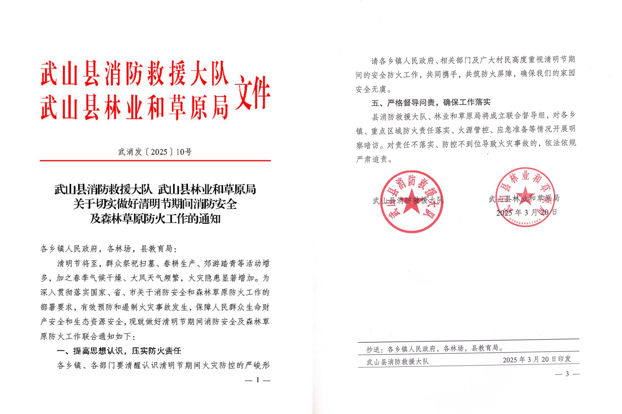 主动联动,压实防控责任。武山县消防救援大队积极与县林业和草原局沟通协调,联合发文至各乡镇、教育局,明确要求各乡镇切实履行消防安全主体责任,加强清明节期间火灾防控工作。文件强调,各乡镇要建立健全火灾防控工作机制,加强对重点区域、重点时段的巡查检查,确保各项防控措施落到实处。同时,要求各乡镇加强对群众的宣传教育,提高群众的消防安全意识和自防自救能力。