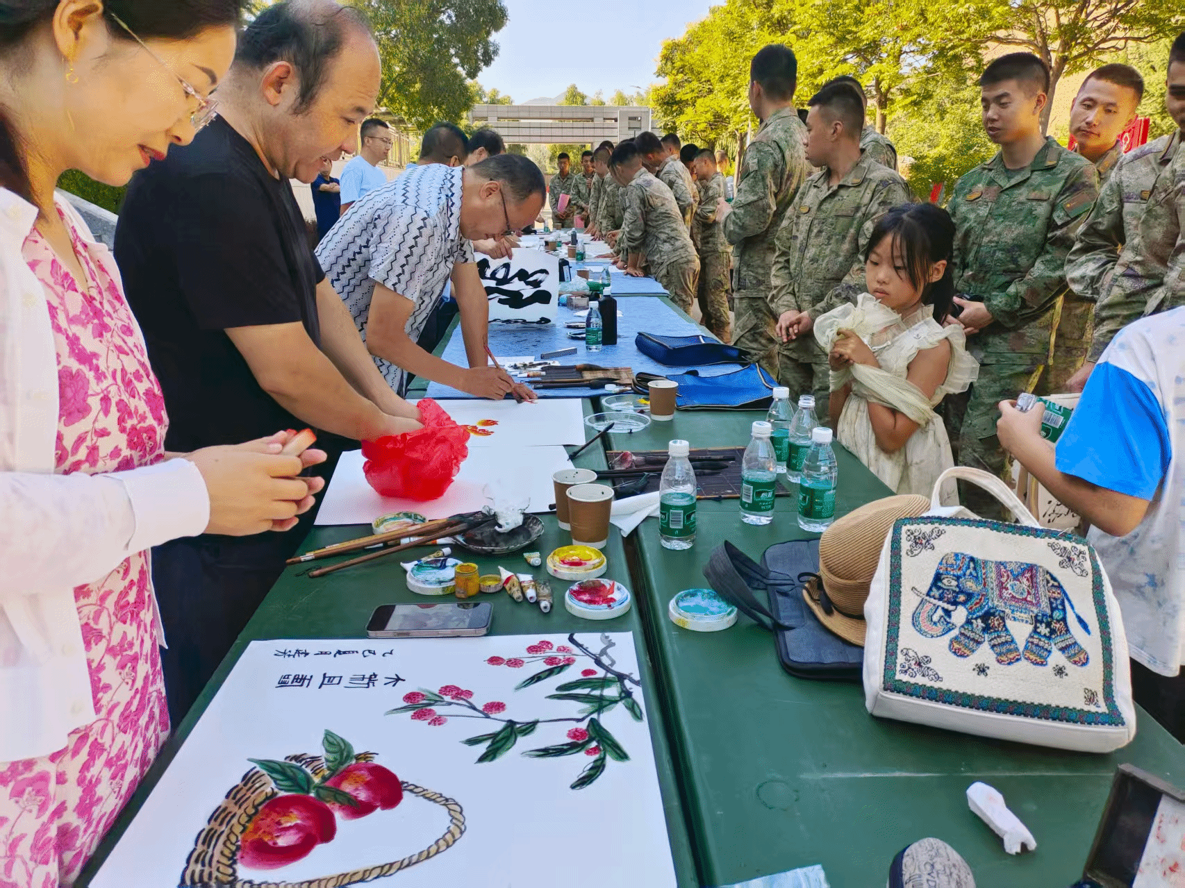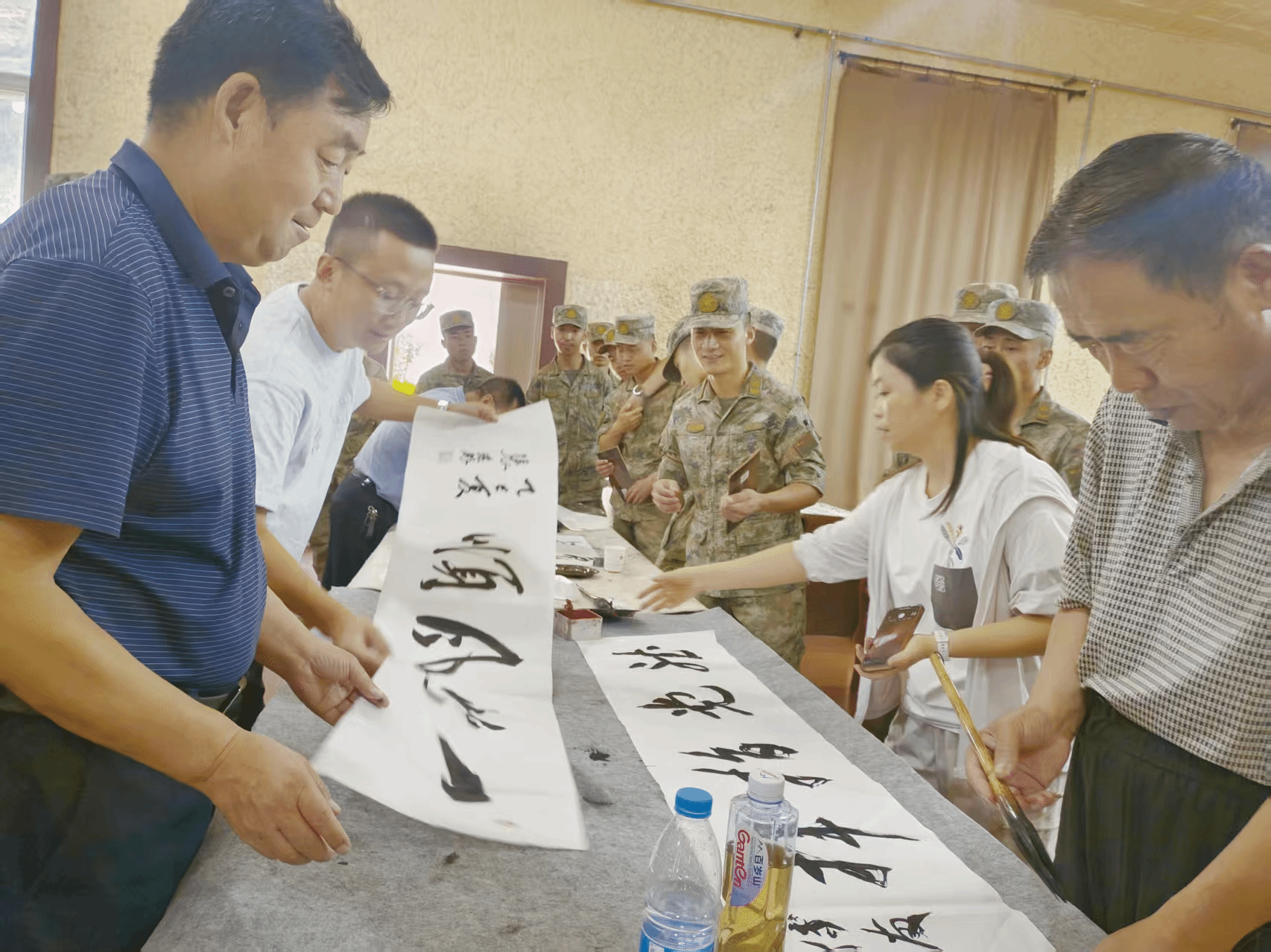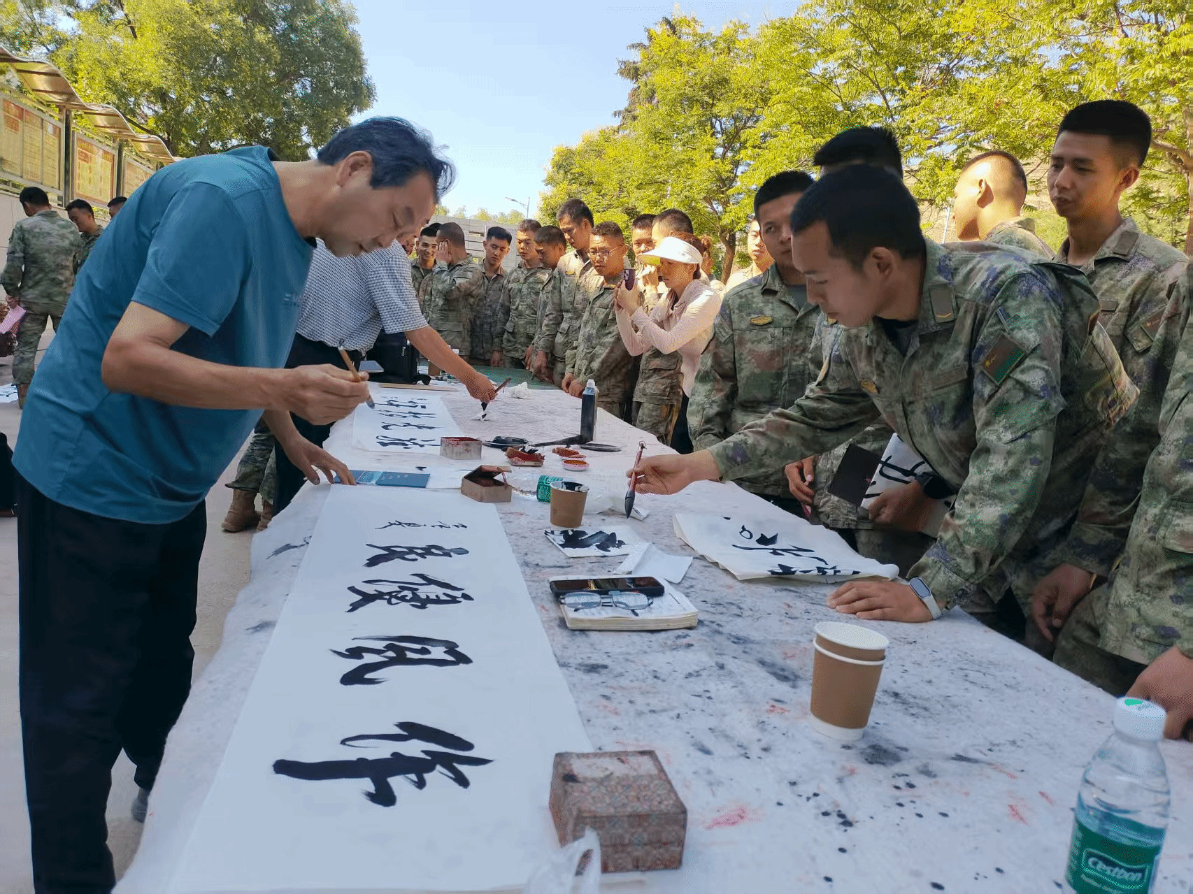 活动现场,翰墨飘香,气氛浓厚热烈,书法家们与官兵互动交流,介绍书法艺术的精髓,并现场为官兵挥毫泼墨,倾情创作出“作风优良”“能打胜仗”听党指挥”“精忠报国”等100余幅书画作品。创作结束后,艺术家们将一幅幅寓意美好、充满祝福的书画作品赠送给部队官兵,表达了他们对军人的崇高敬意,激励官兵坚守岗位、刻苦训练,更好地维护社会稳定,保障人民群众安居乐业。