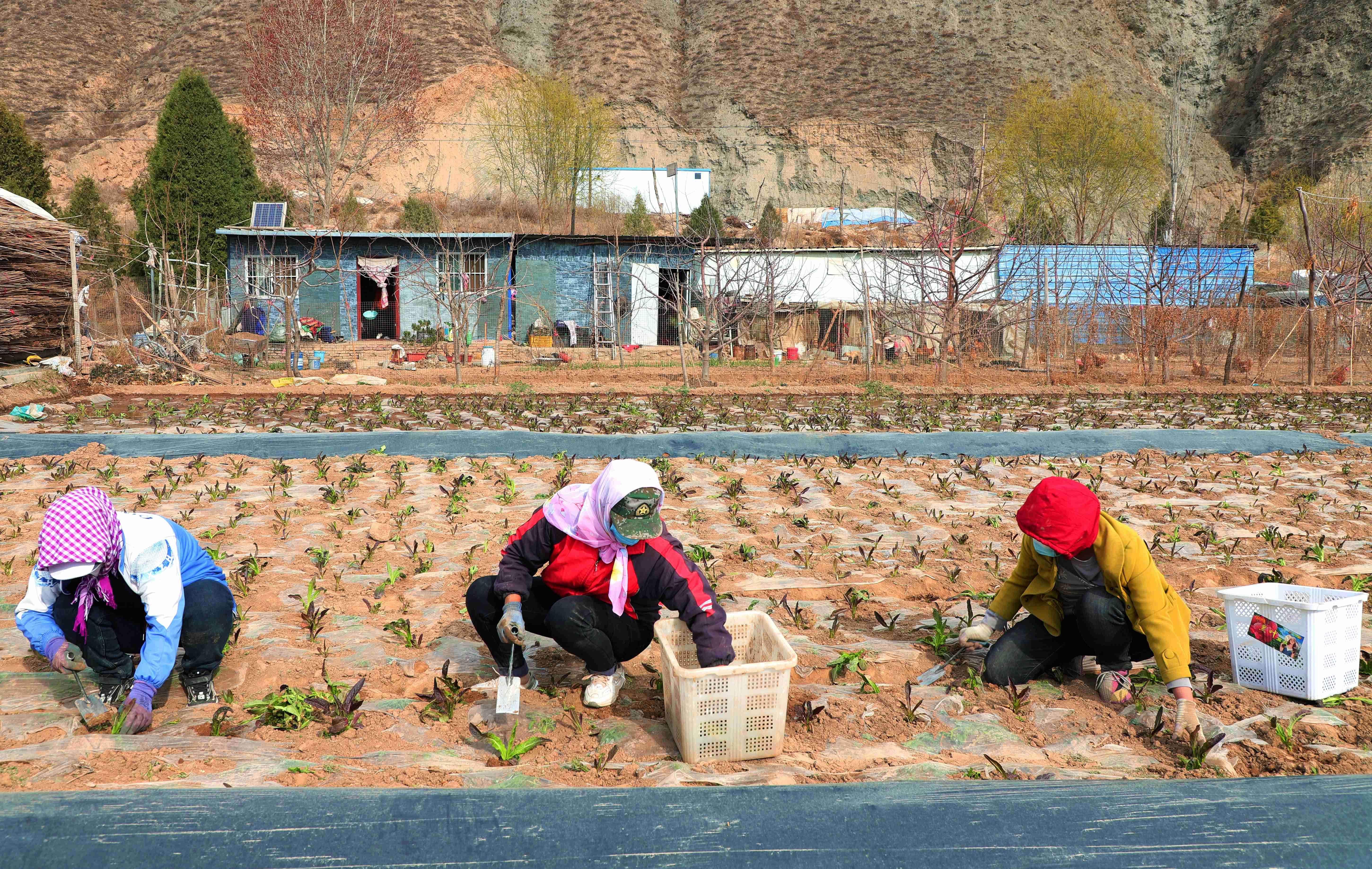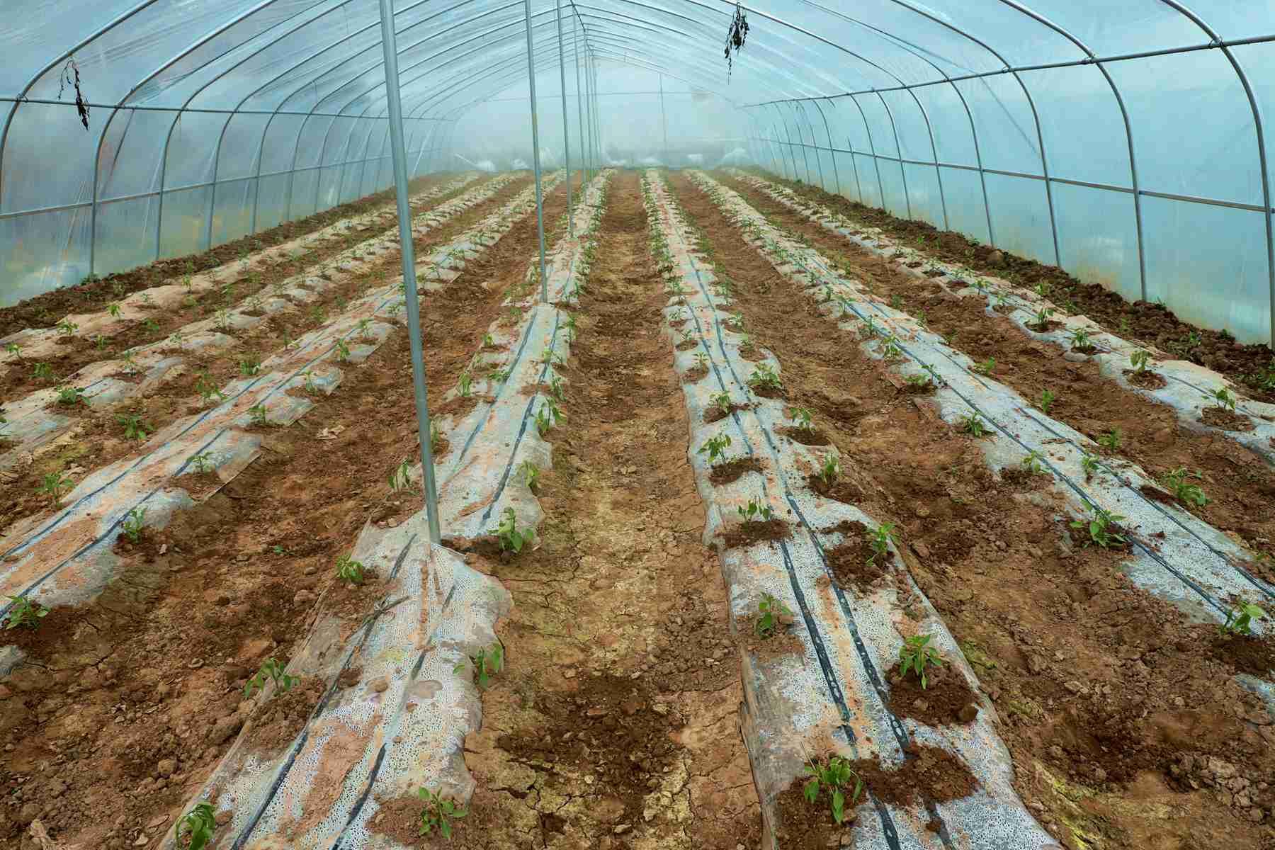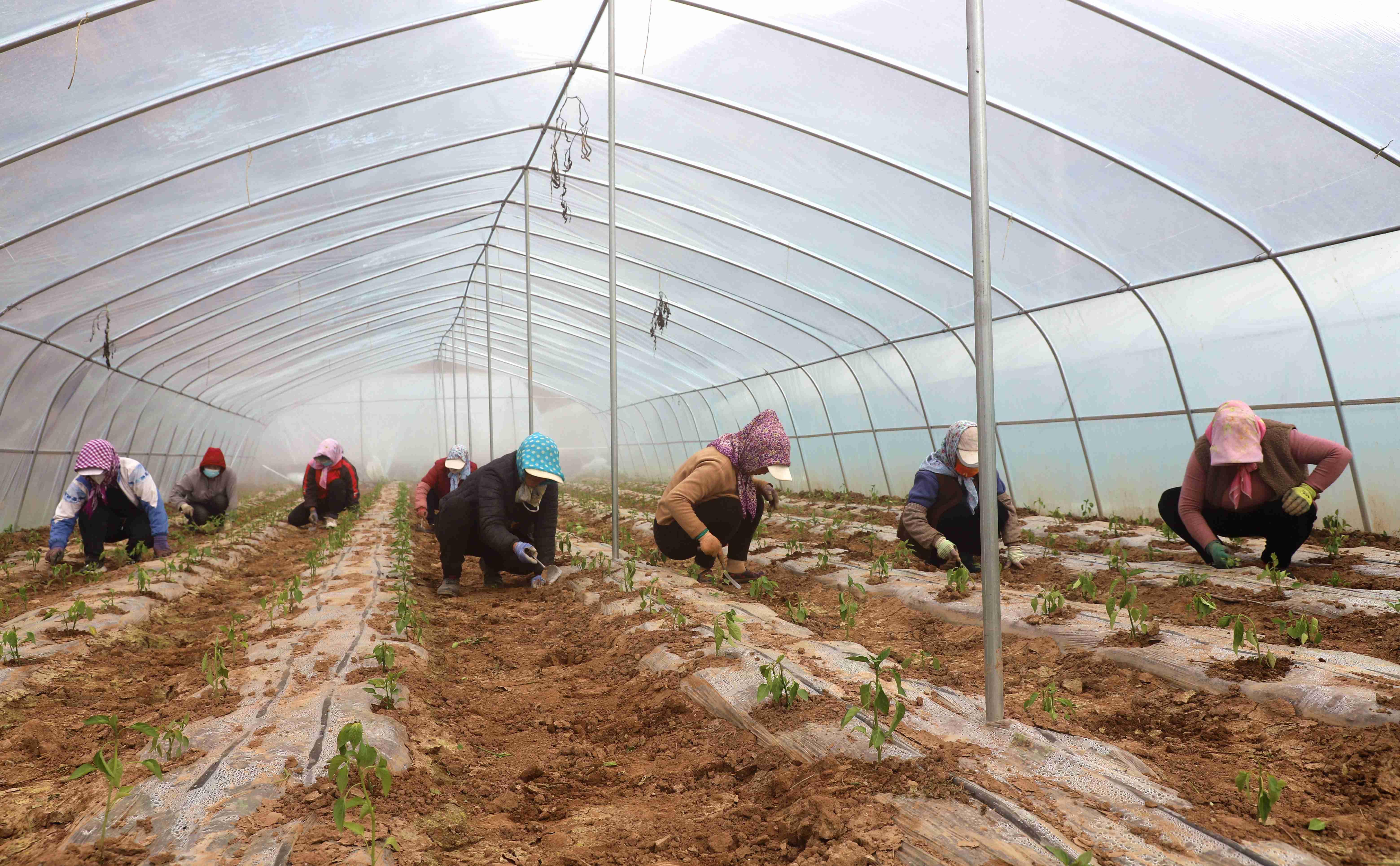 在盘古村钢架大棚里,刚移栽的蔬菜苗绿油油。春节过后,盘古村架起的384个蔬菜钢架大棚重新铺上了塑料“外衣”。负责人介绍,棚里主要种植辣椒、架豆、蒲公英、苦菊等作物,2月6日开始覆膜,24日开始移栽幼苗,估计五一过后大棚蔬菜就可以全面上市了。