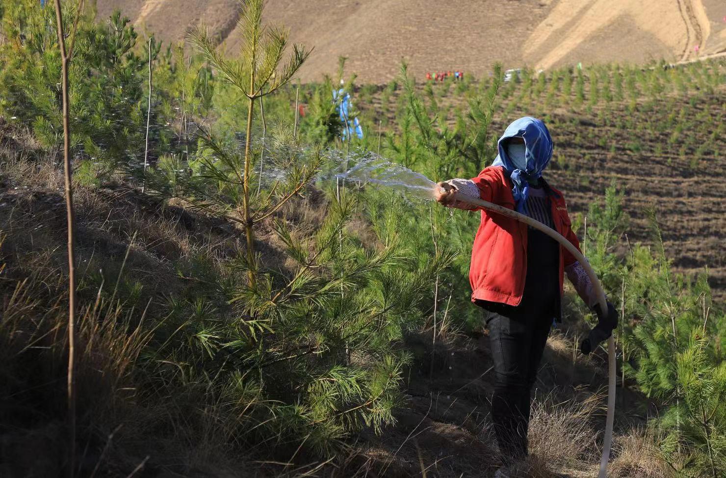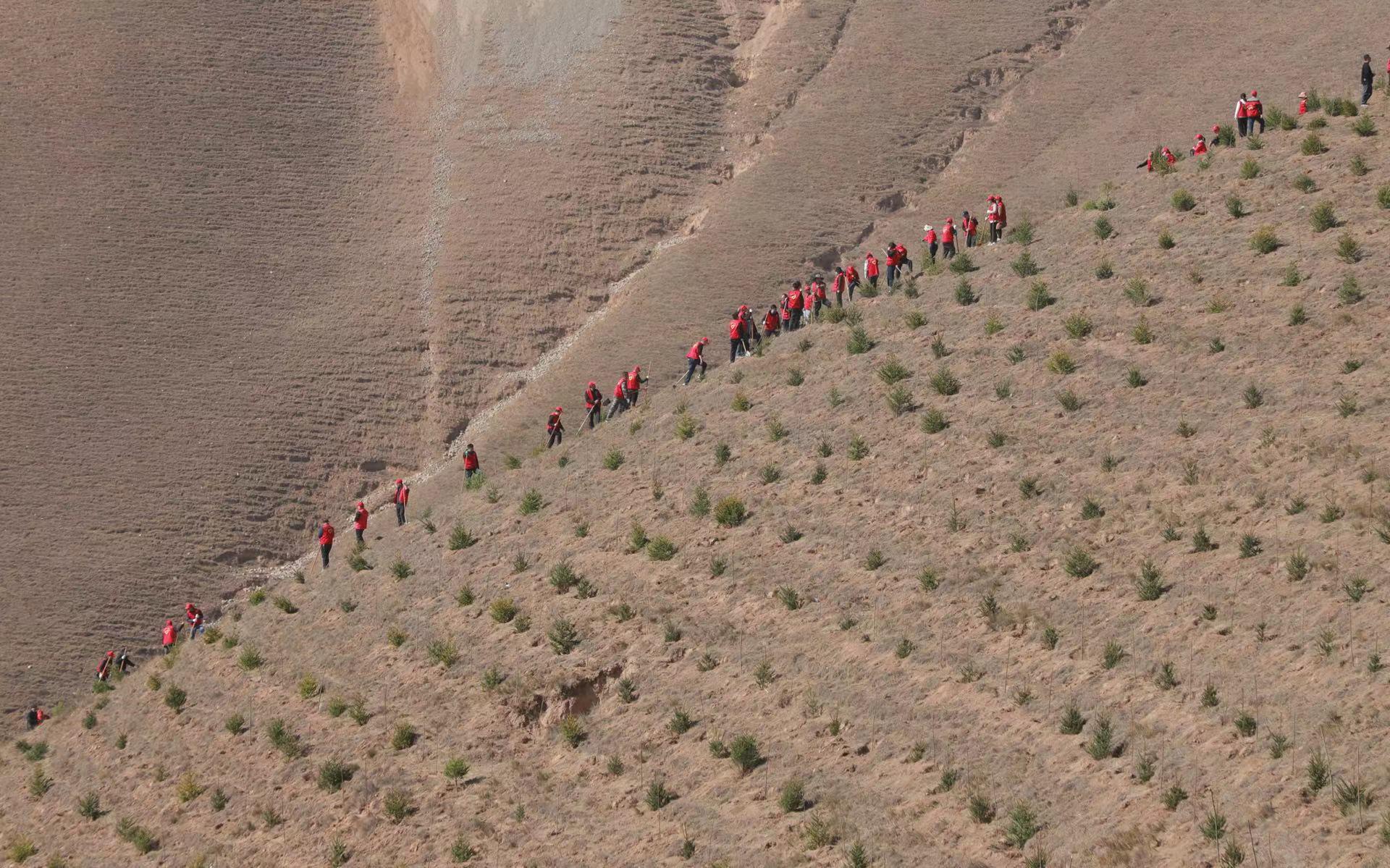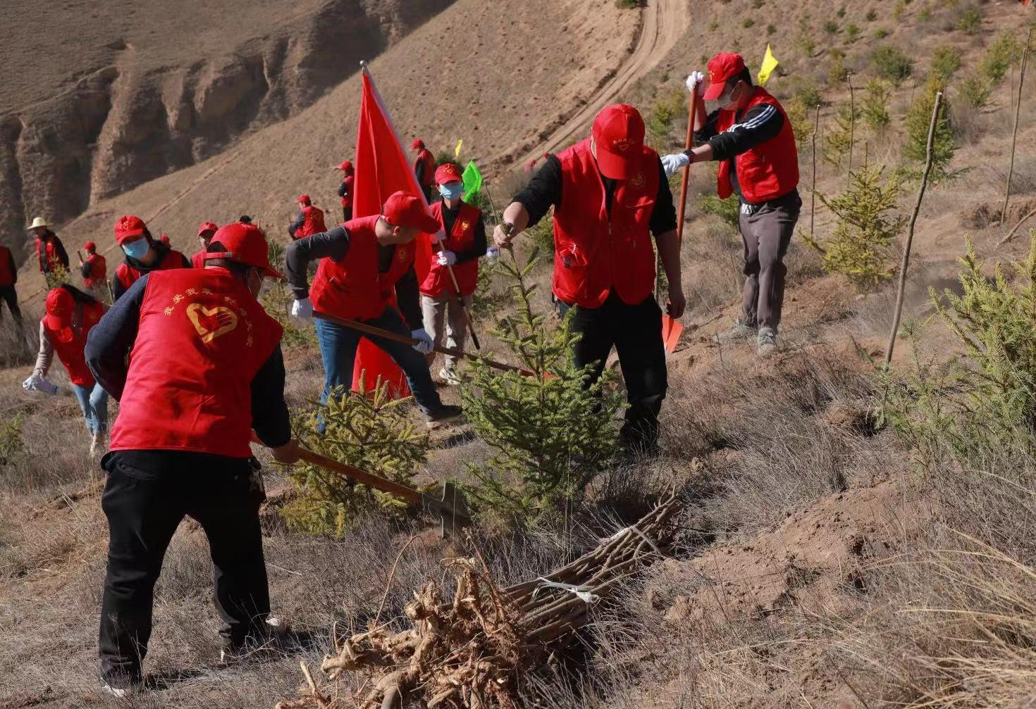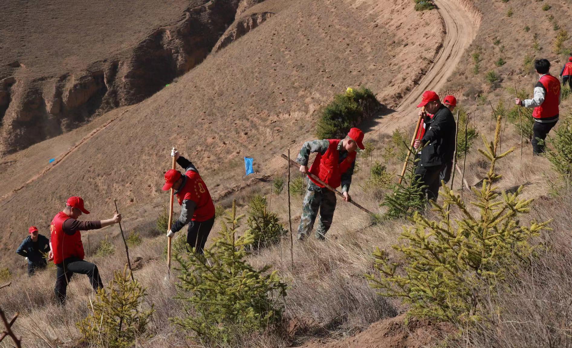今日种下一棵苗,他年绿树必成荫。走进盘龙山义务植树点,漫山遍野到处都是红马甲的身影,只见大家一起挥锹铲土、培土围堰、提水浇灌……香花槐、榆树、云杉、红叶李、樟子松等一棵棵树苗迎风而立,充满勃勃生机,为美丽武山再添一片新绿。