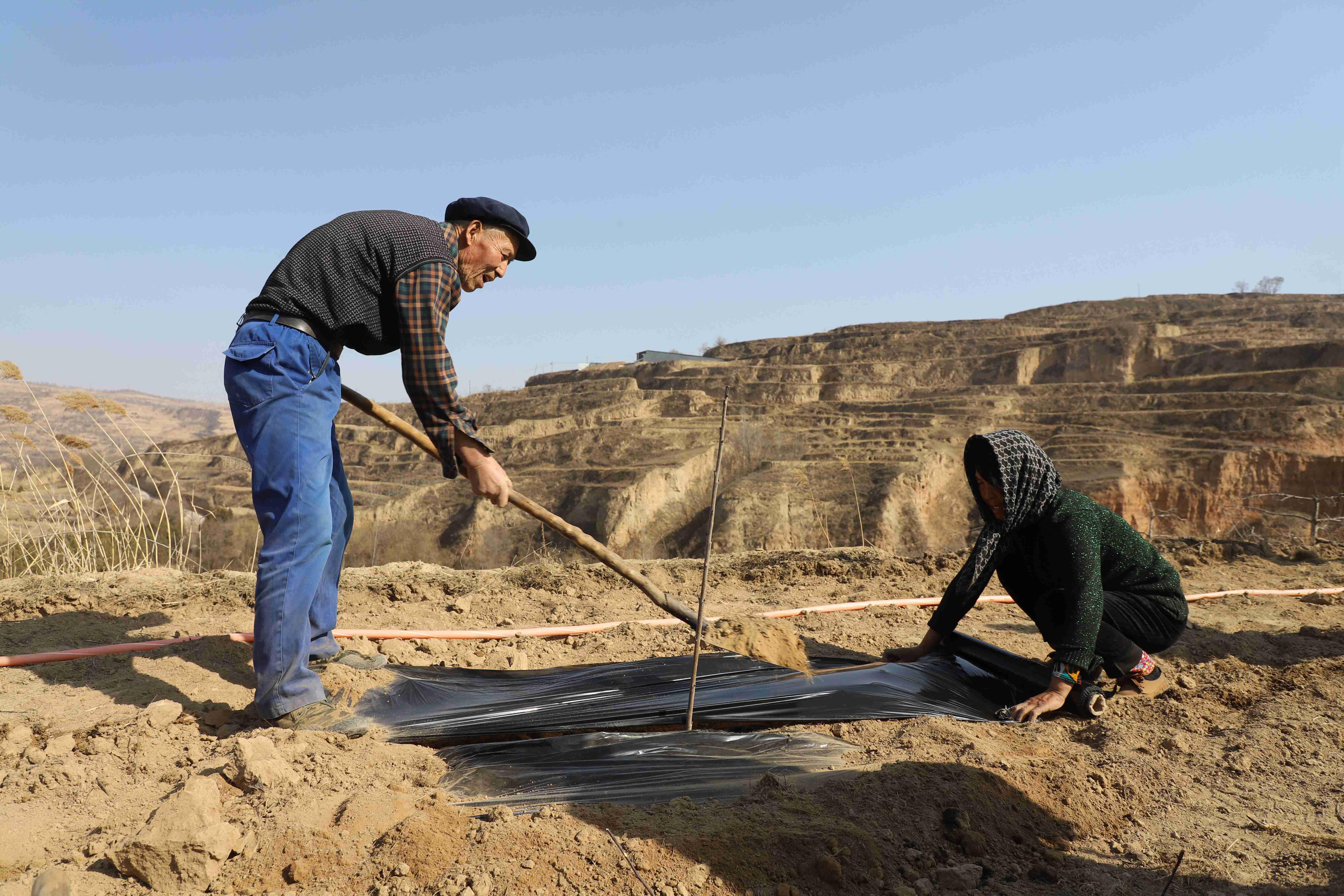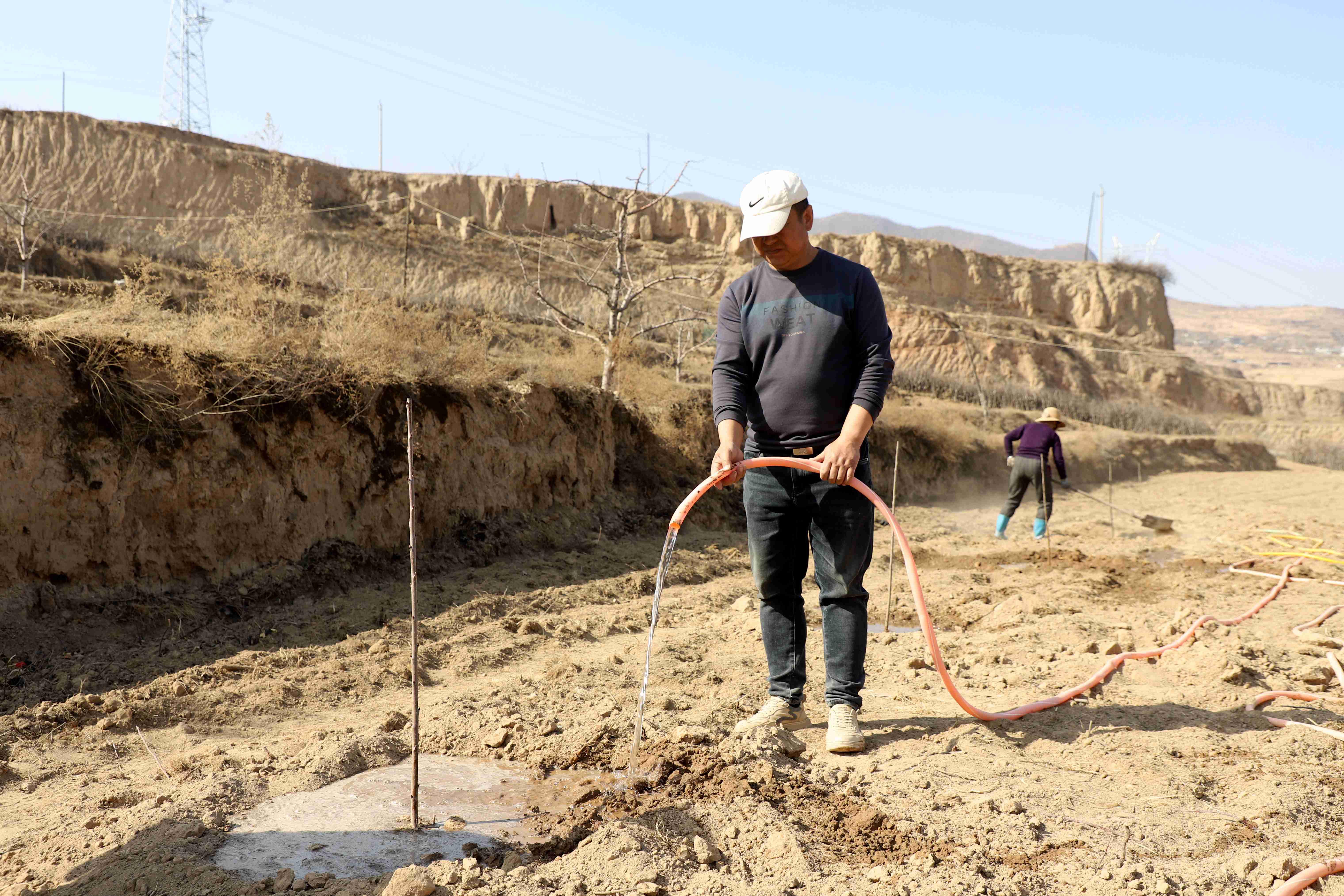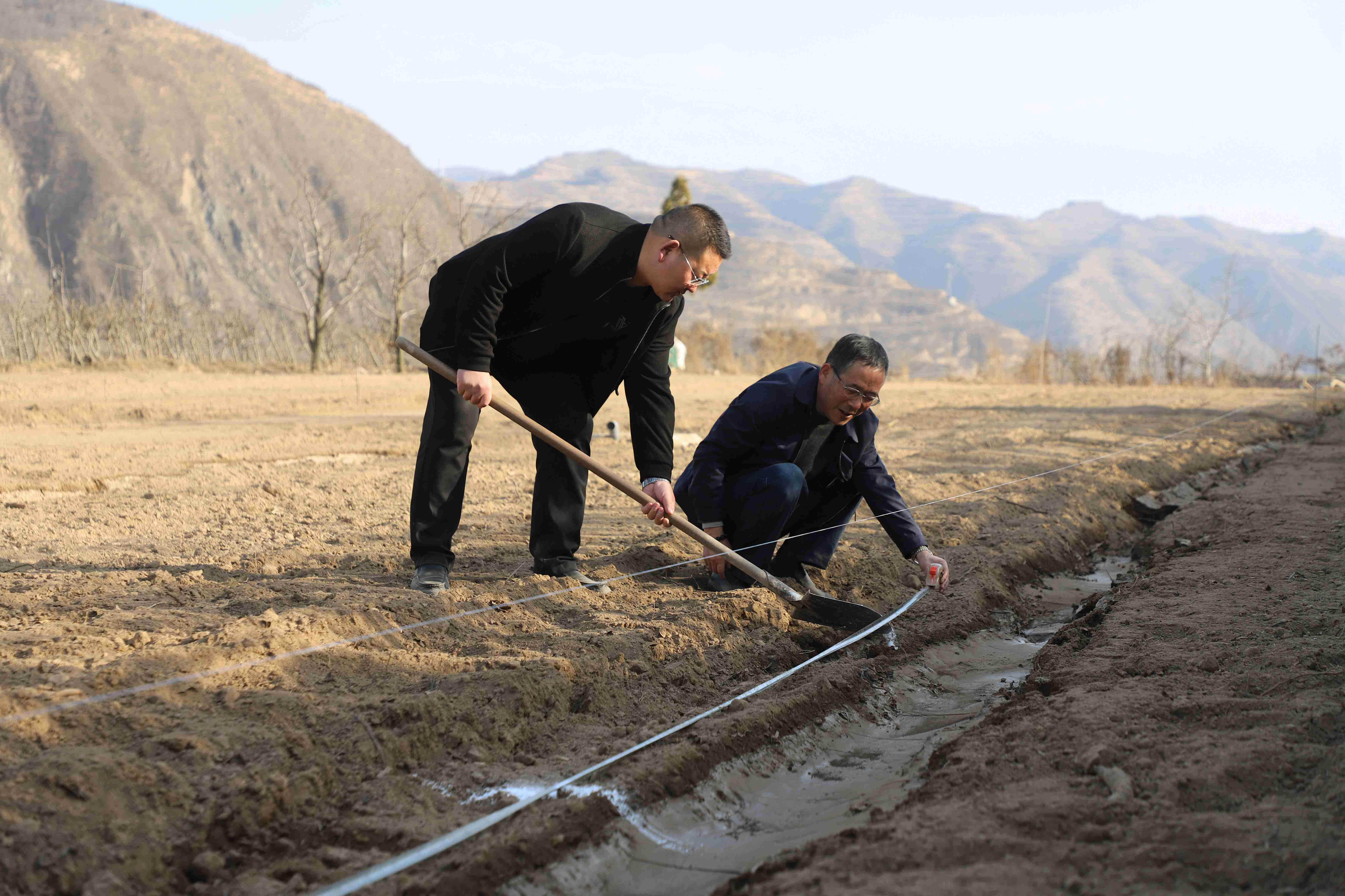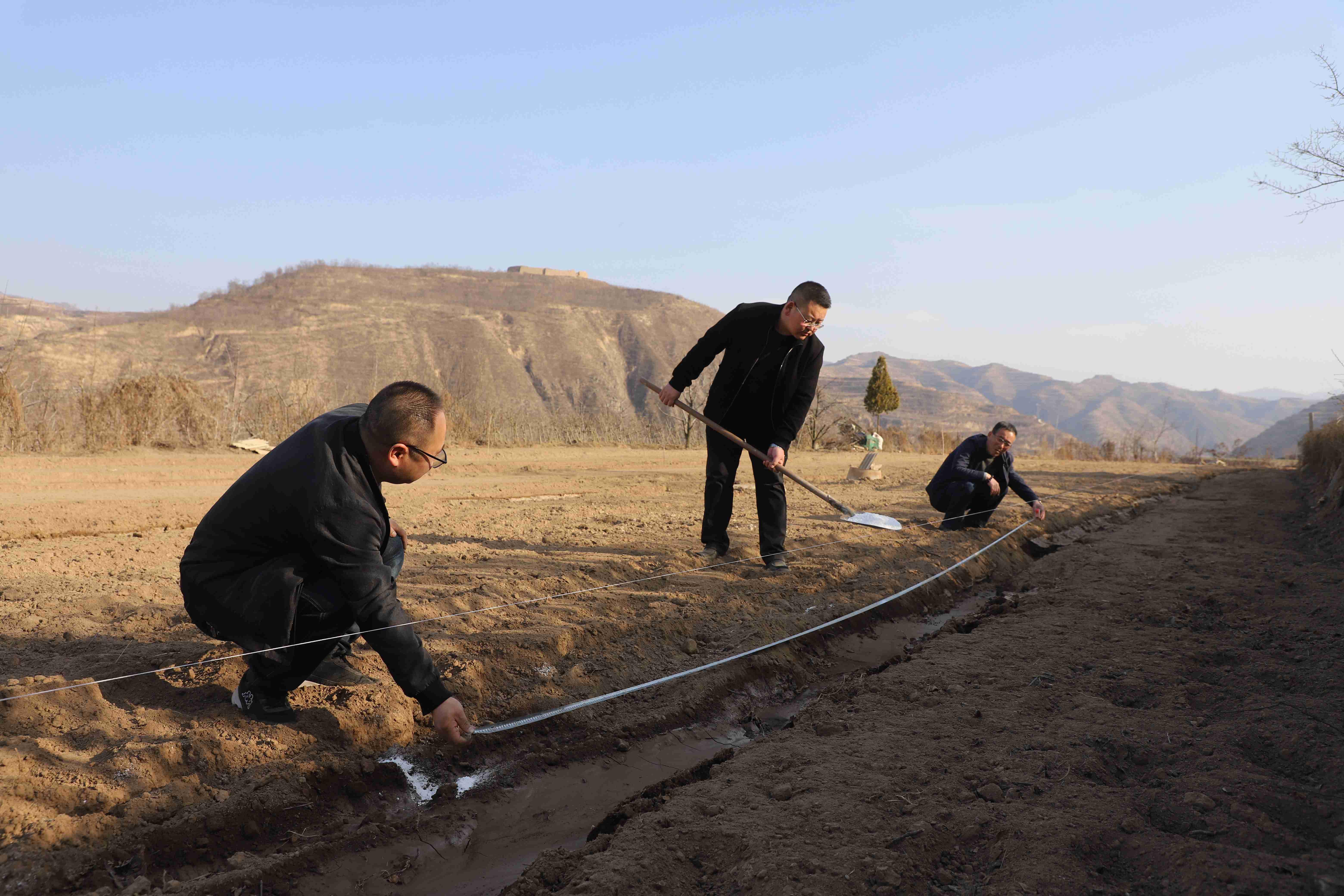 武山县融媒体中心3月7日讯(记者 郭永强 王正平)“最近天气比较干旱,一定要把水浇透,然后把黑膜及时铺上……”3月6日,在武山县润博果蔬专业合作社果园中,武山县果业发展中心主任张冬冬带领技术员对栽树人员进行技术指导。针对果树老化问题,今年该合作社申请老果园迭代更新改造项目,对100亩老旧苹果树进行改造,种植新品种大樱桃,让老果园焕发新生机。