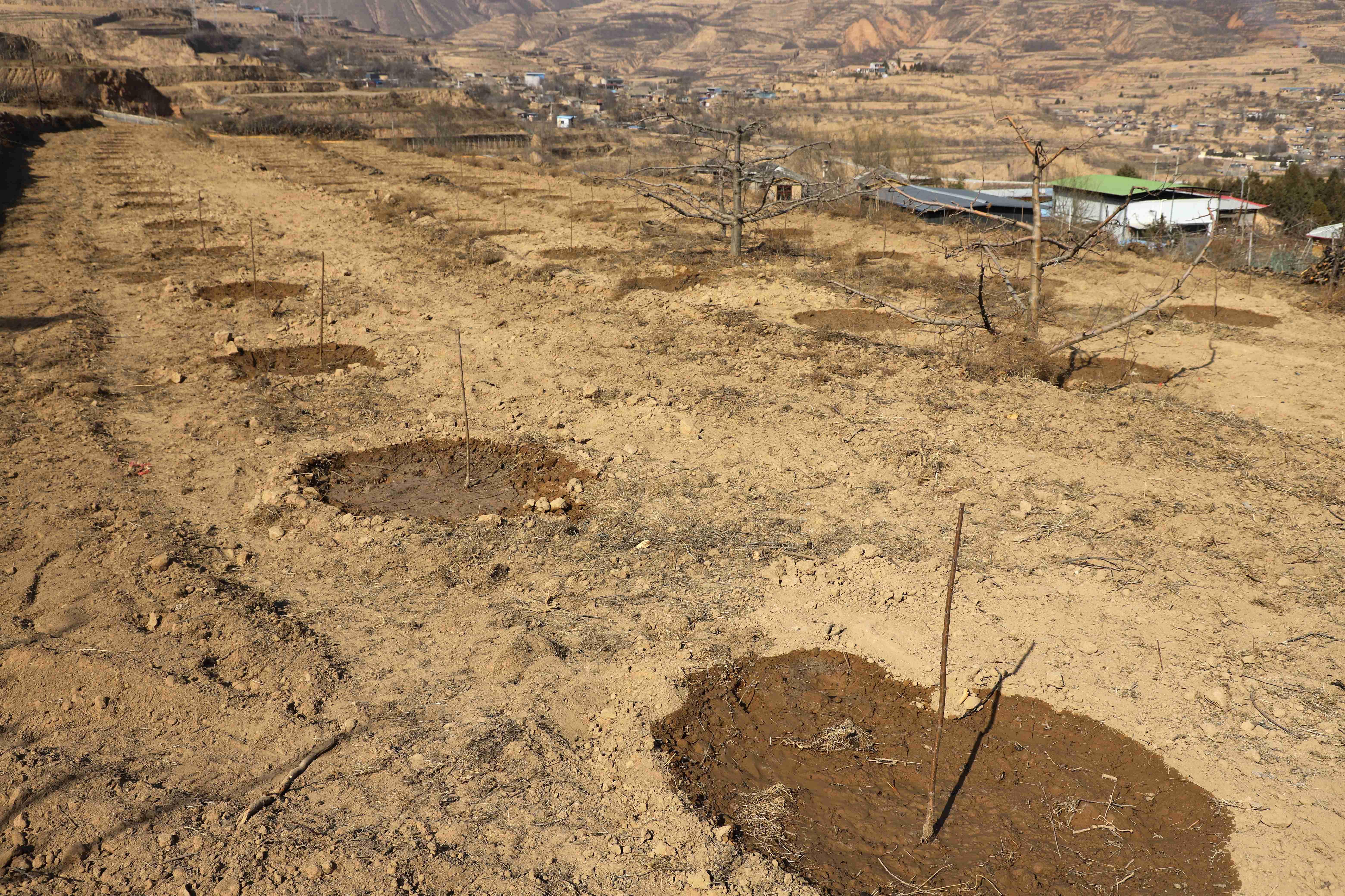 果园改造不仅涉及较大的合作社,也倾向于个体果农。洛门镇蓼阳村是传统的苹果种植村,全村苹果面积近300亩。果农陈军应家有苹果园12亩,今年通过项目改造5亩。“这是1986年建的一片果园。通过今年的老果园更新项目,把以前的老红元帅就都淘汰干净了,这次就建成富士园了,栽的烟富6号,这个品种这几年效益相当好。”陈军应介绍,这几天抓住春天的有利时机对挖开的丰产沟回填了秸秆和有机肥,马上就开始栽植果树了。