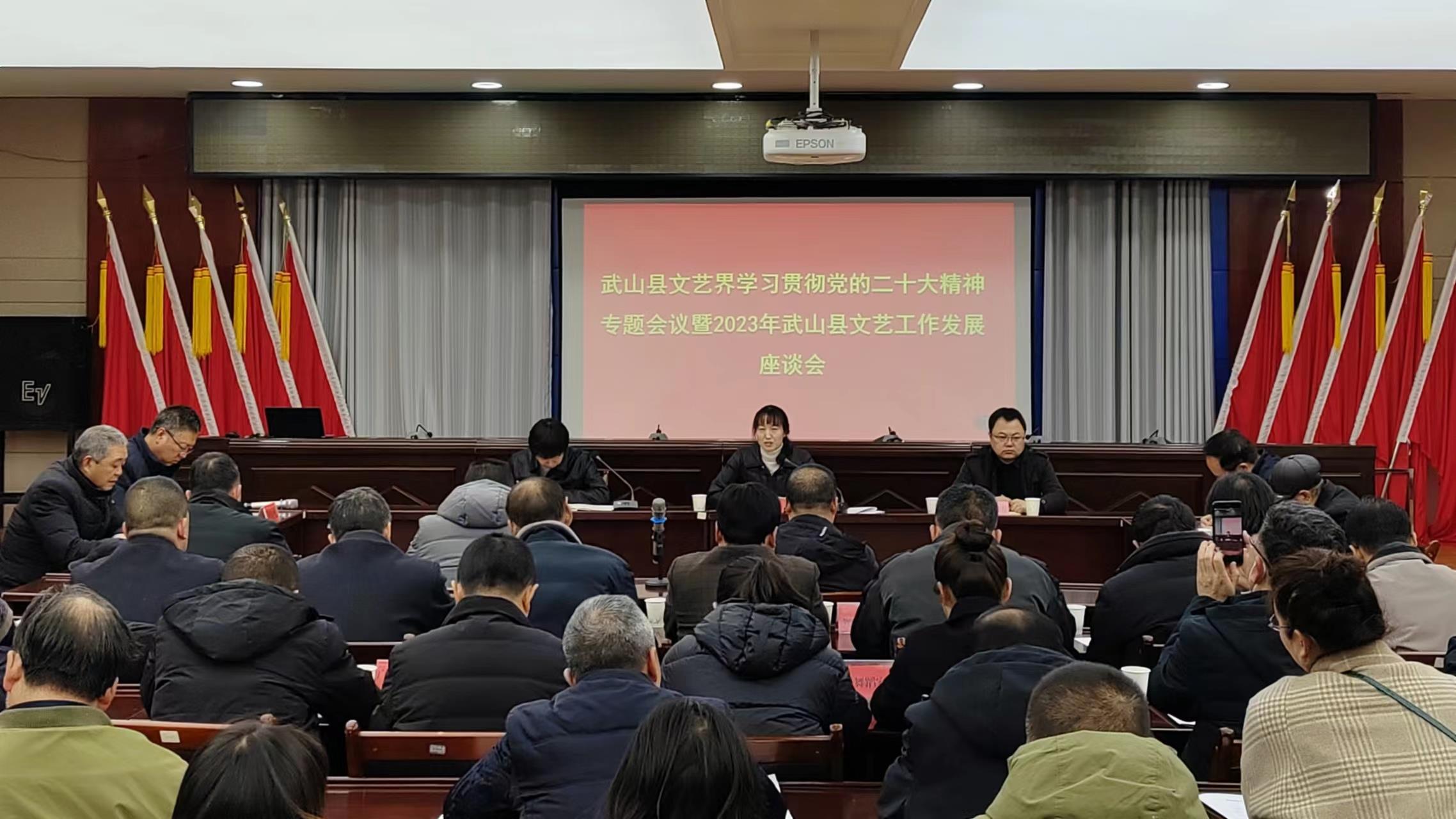 武山县融媒体中心2月17日讯(记者 关正庚 杨 洋)2月16日,武山县文学艺术界联合会组织召开学习贯彻党的二十大精神专题会议暨2023年武山县文艺工作发展座谈会,县委常委、宣传部部长胡丽霞出席会议并讲话。县广播电视艺术家协会、音乐舞蹈家协会、摄影家协会、民间文艺家协会、作家协会、书法家协会、美术家协会、鸳鸯玉艺术家协会等各协会负责人及主要成员参加座谈会。