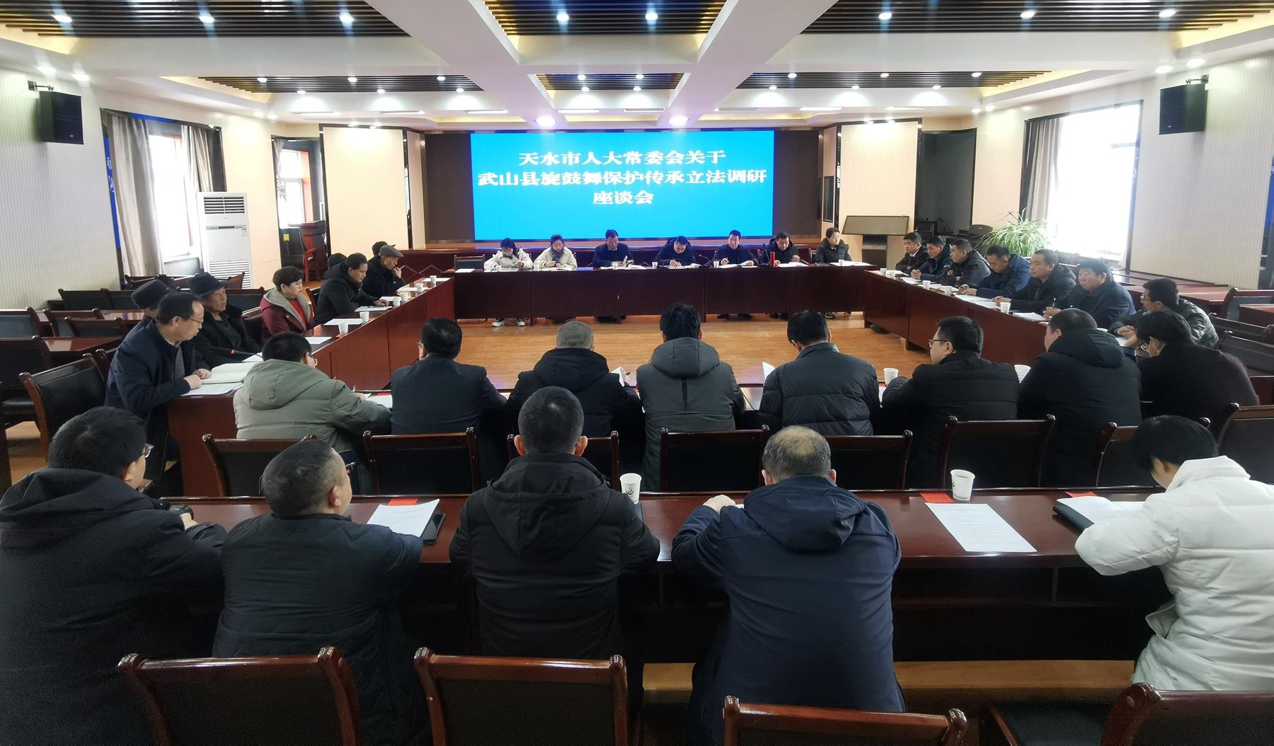 武山县融媒体中心2月14日讯(记者 李益 朱盼盼)2月14日,市人大常委会调研组在武山县召开武山旋鼓舞保护传承立法调研座谈会议。市人大常委会法制工委主任陈维林主持会议。市人大常委会法制工委、市文旅局、市司法局相关人员,县人大常委会副主任郭海涛,县人大办、政府办、政协办及发改、文旅局等部门分管领导,国家级、省级、市级、县级武山旋鼓舞传承人参加会议。