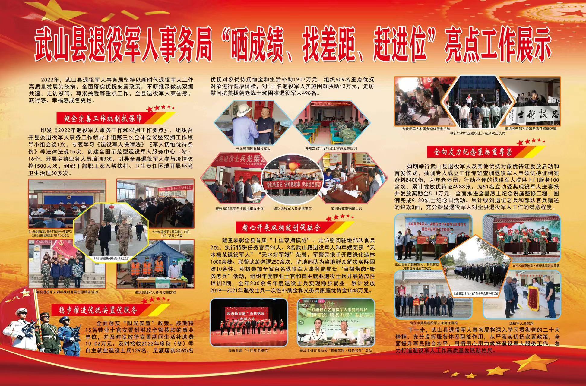 2022年,武山县退役军人事务局坚持以新时代退役军人工作高质量发展为统揽,全面落实优抚安置政策,不断推深做实双拥共建、走访慰问、尊崇关爱等重点工作,全县退役军人荣誉感、获得感、幸福感成色更足。
