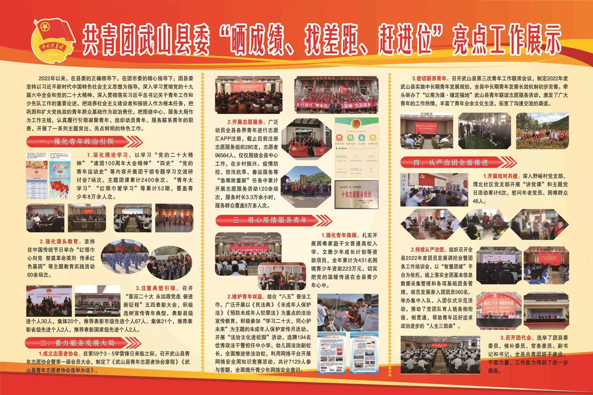 着力服务发展大局。成立志愿者协会。在第59个3·5学雷锋日来临之际,召开武山县青年志愿协会暨第一届会员大会,制定了《武山县青年志愿者协会章程》《武山县青年志愿者协会选举办法》。开展志愿服务。广泛动员全县各界青年进行志愿汇APP注册,截至目前注册志愿服务组织280支,志愿者96564人,紧紧围绕全县中心工作,在乡村振兴、疫情防控、防汛抗旱、春运服务等“急难险重新”任务中累计开展志愿服务活动120余场次,服务时长3.3万余小时,服务群众覆盖9万多人用心用情服务青年。强化青年保障。扎实开展困难家庭子女普通高校入学、文雅少年成长计划等资助项目,全年累计为431名困境青少年资助223万元,切实把党的温暖传递在全县青少年心中。维护青年权益。结合“八五”普法工作,广泛开展以《民法典》《未成年人保护法》《预防未成年人犯罪法》为重点的法治宣传教育,积极参加“学习二十大,同心护未来”为主题的未成年人保护宣传月活动。开展“法治文化进校园”活动,选聘194名优秀政法干警担任中小学、幼儿园法治副校长,全面推进依法治校。利用网络平台开展网络安全周知识竞赛活动,共计7129人参与答题,全面提升青少年网络安全意识。密切联系青年。召开武山县第三次青年工作联席会议,制定2022年度武山县实施中长期青年发展规划,全县中长期青年发展长效机制初步完善。牵头举办了“以菊为媒·缘定福地”武山县青年联谊志愿服务活动,激发了广大青年的工作热情,丰富了青年业余文化生活,拓宽了沟通交流的渠道。