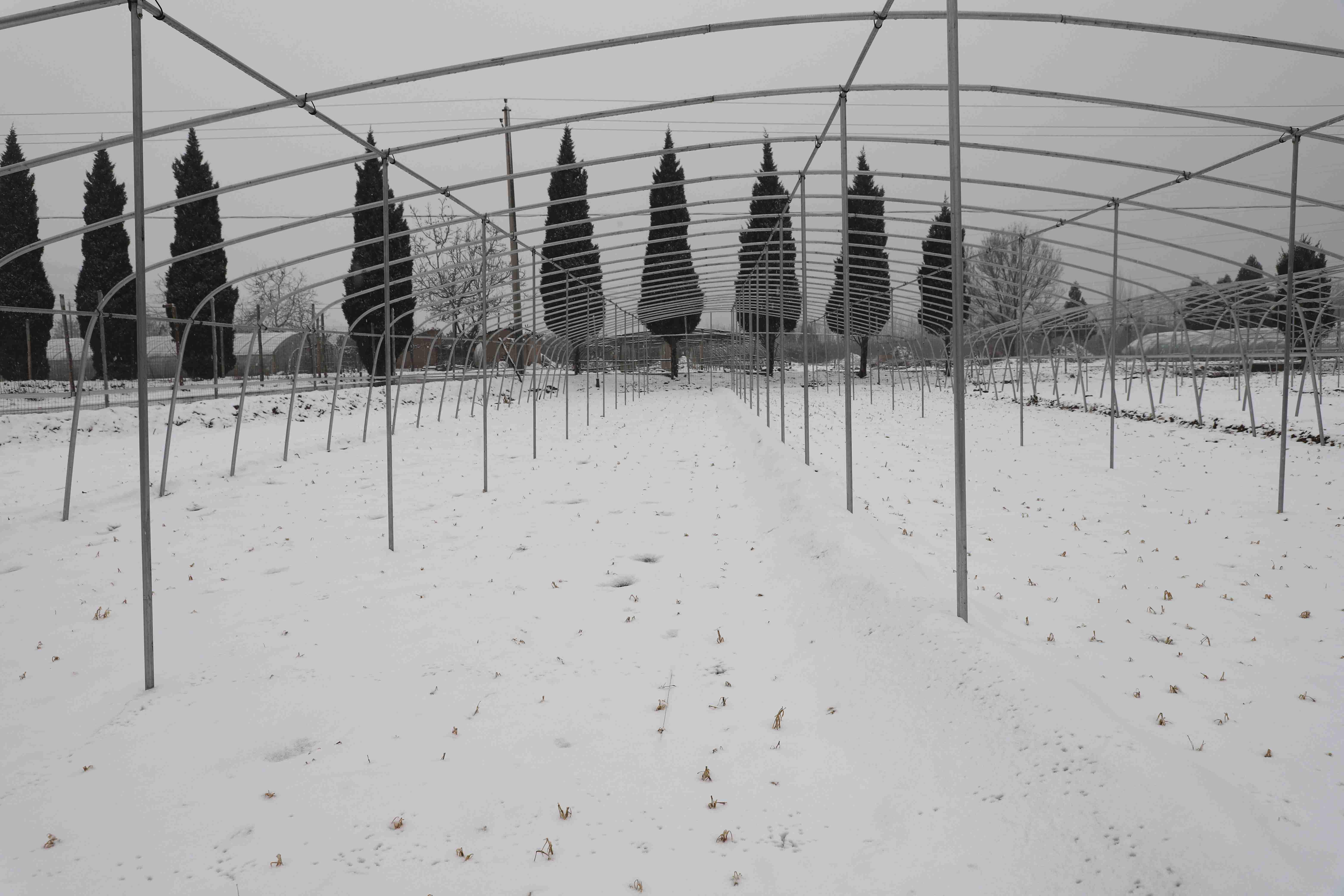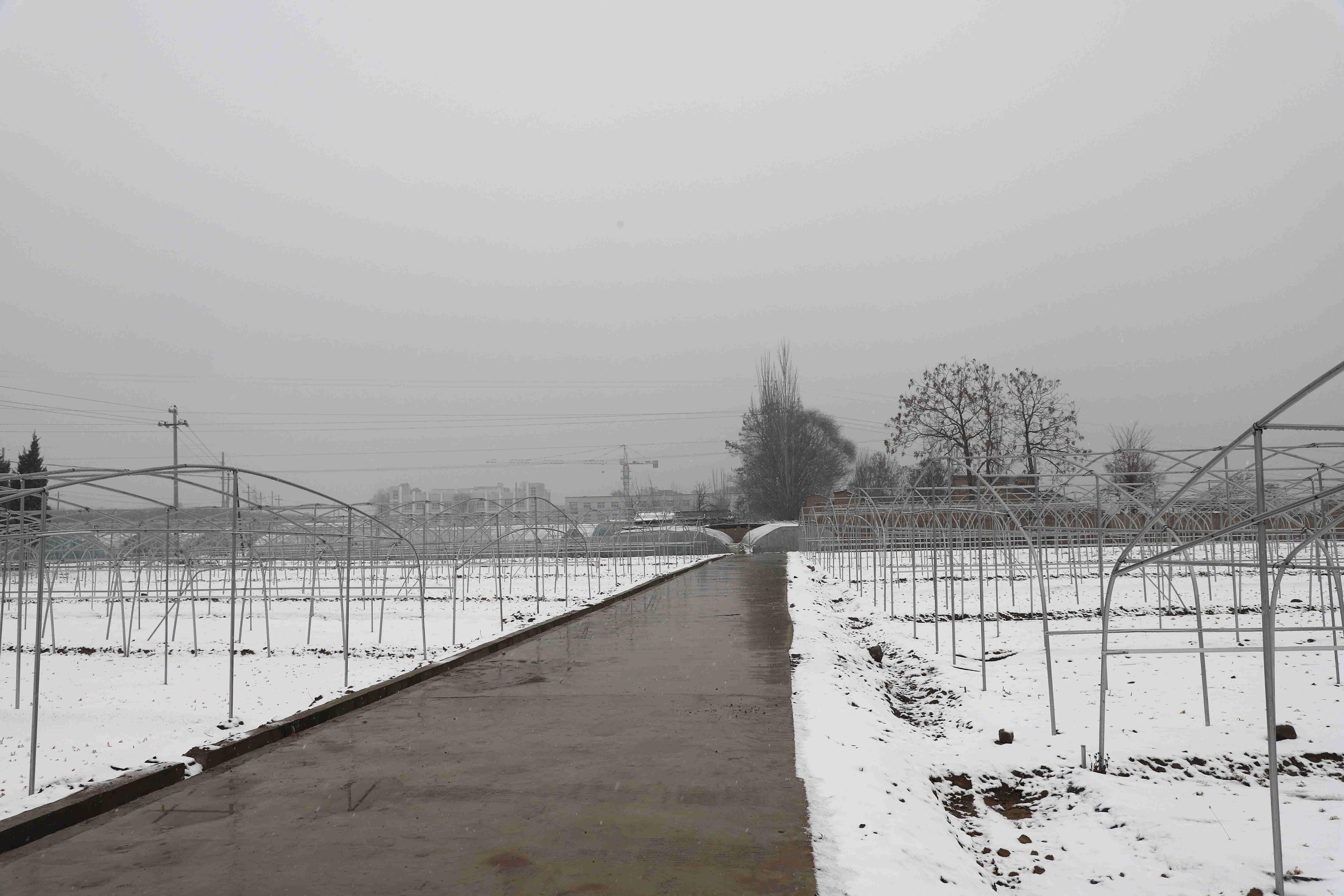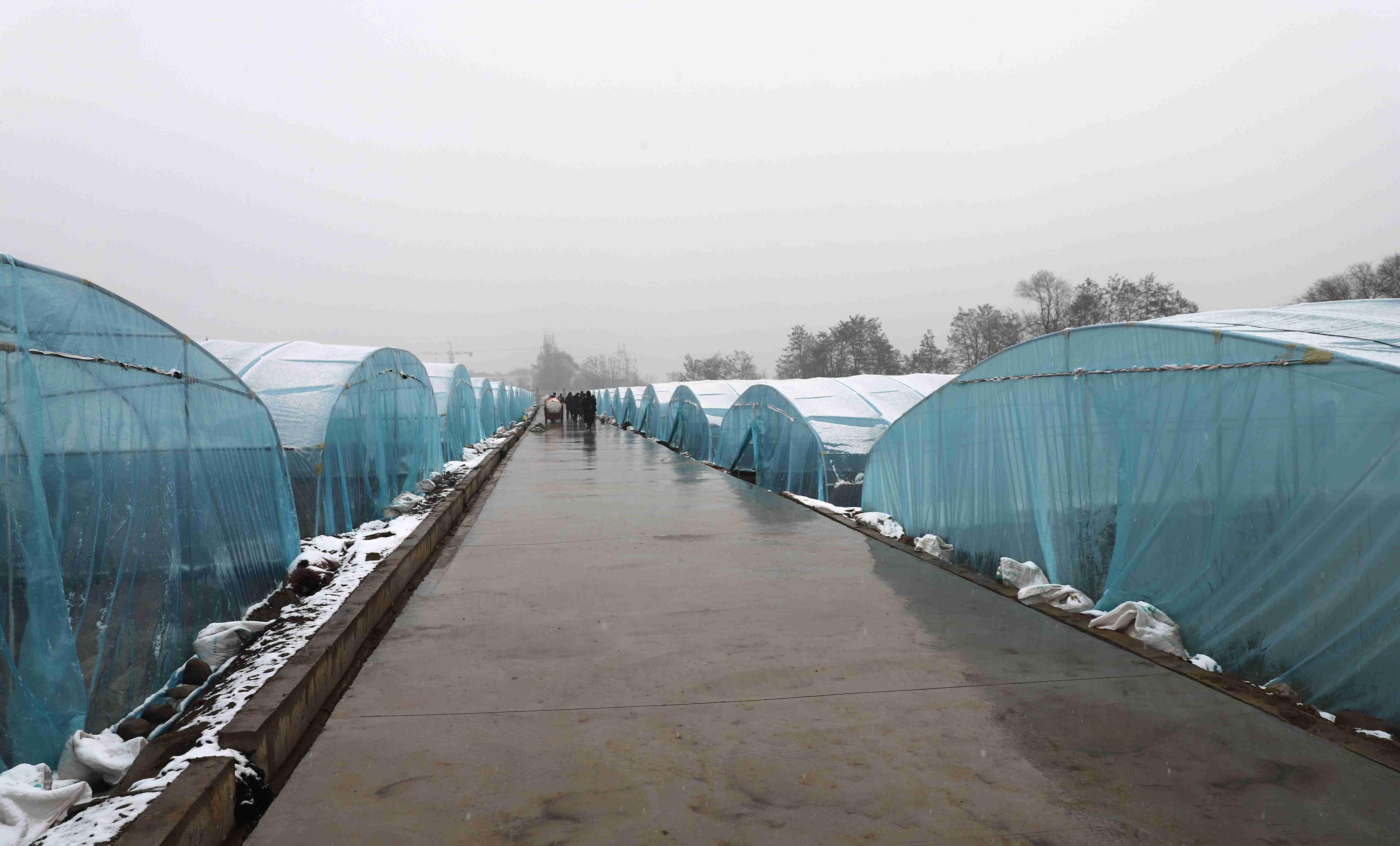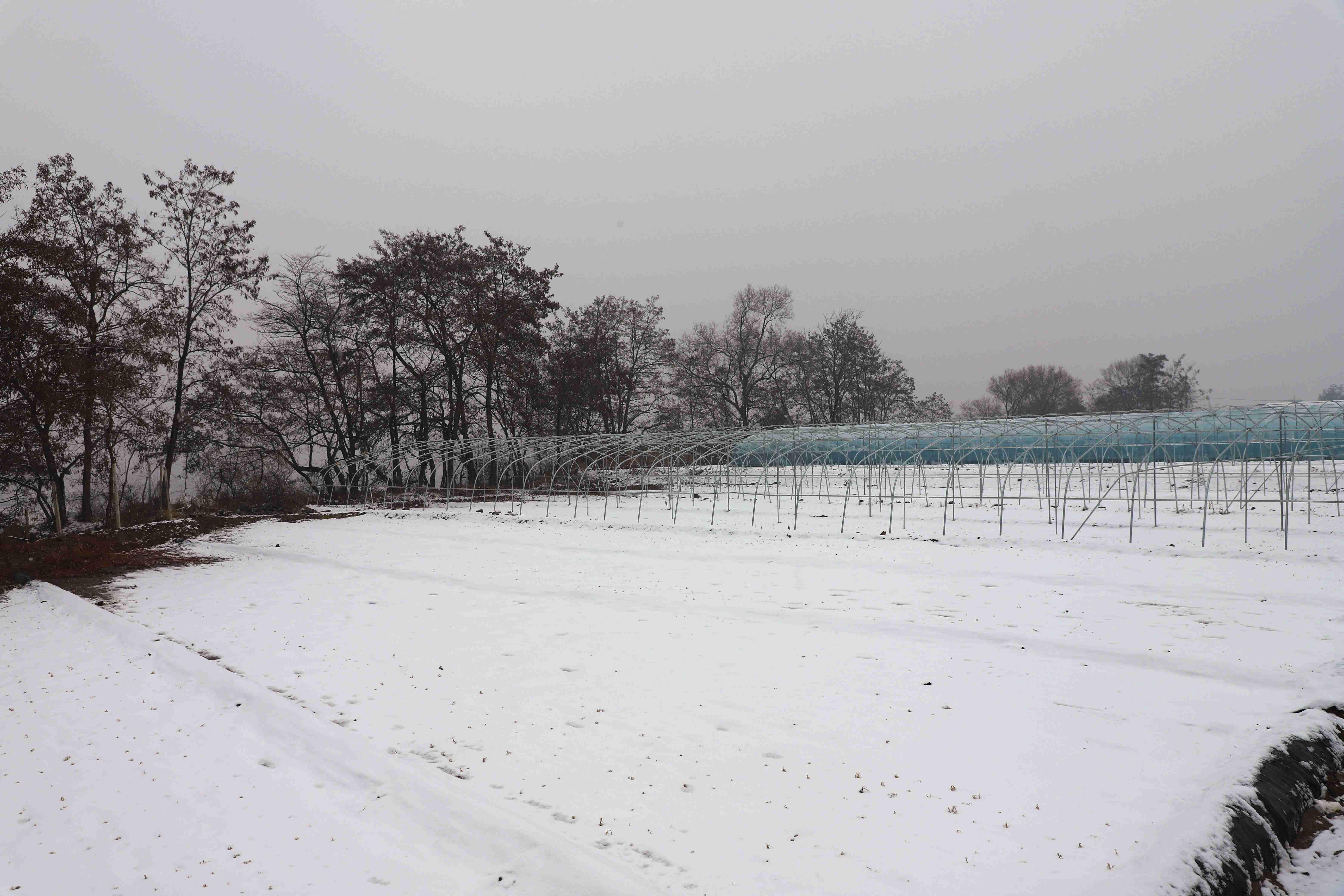 在文家寺村蔬菜种植专业合作社基地,还未覆膜的钢架大棚下白雪一片,稚嫩的韭菜苗才刚刚探头。