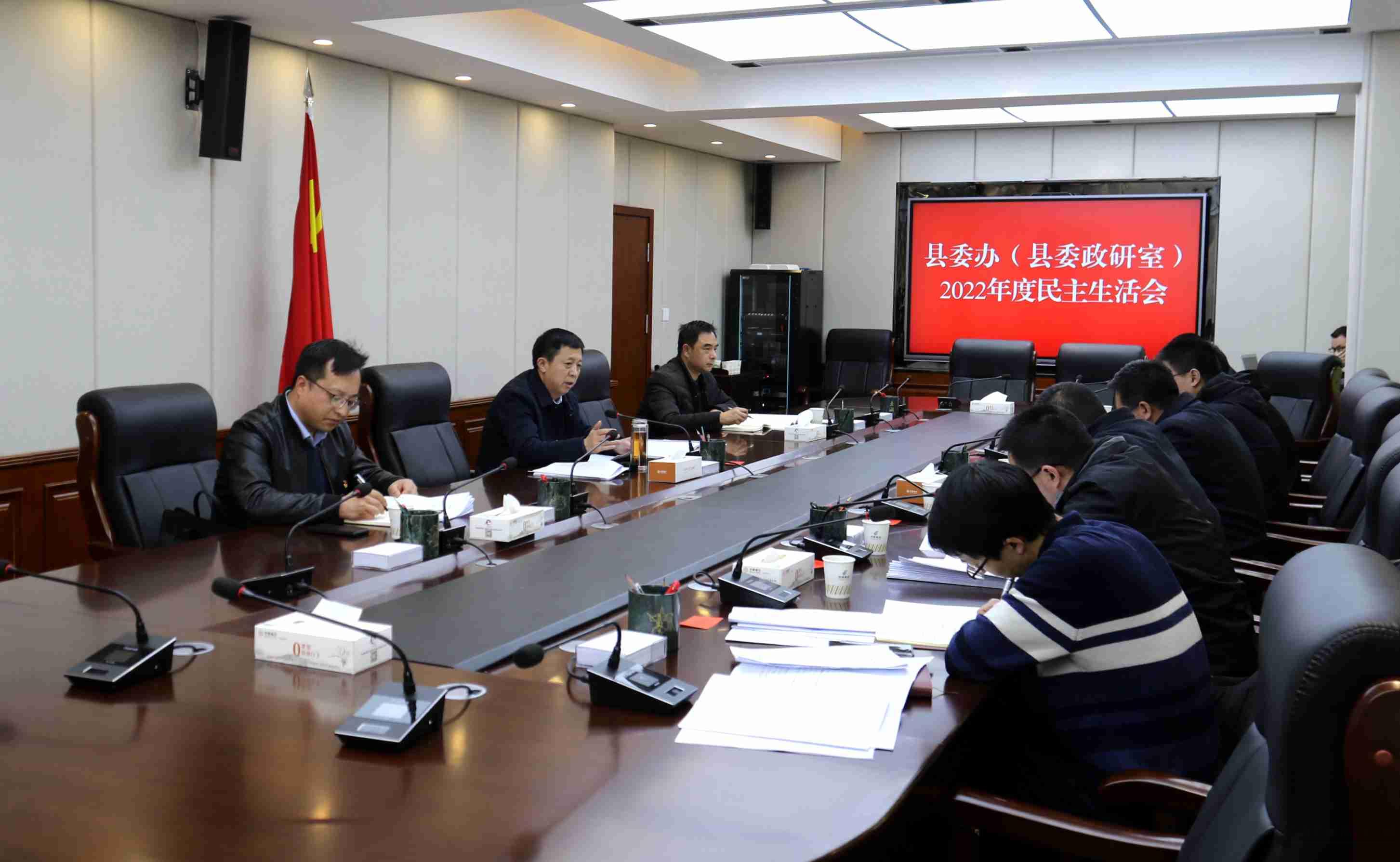 武山县融媒体中心2月9日讯(记者 杨彦春)根据县委统一部署,2月9日,中共武山县委办公室(县委政策研究室)召开2022年度民主生活会。会议聚焦“全面贯彻习近平新时代中国特色社会主义思想,深刻领悟‘两个确立’的决定性意义,增强‘四个意识’、坚定‘四个自信’、做到‘两个维护’,团结带领党员干部群众以奋发有为的精神贯彻落实党的二十大作出的重大决策部署”这一主题,联系县委办公室(县委政策研究室)工作,联系个人思想和工作实际,深入检视问题,查摆差距不足,进行党性分析,开展批评和自我批评,提出改进措施和今后努力方向。