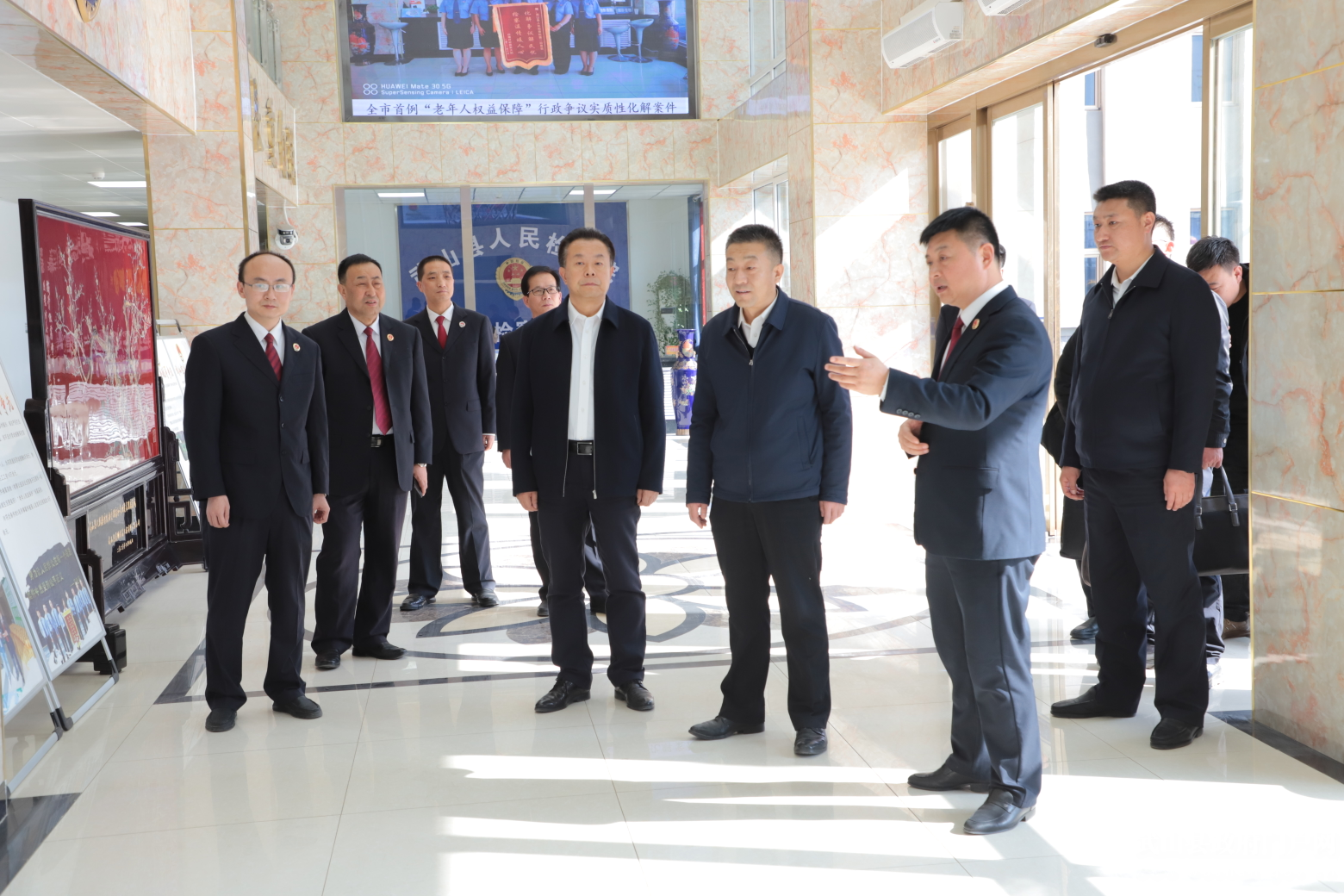 张学军一行先参观了县检察院办案和技术用房、听证室、机房等地,了解基础设施和配套设施建设情况。随后召开座谈会,听取了县院负责人关于学习贯彻中央、省委政法工作会议、全国检察长会议及省“两会”会议精神情况,并对推进检察工作现代化的思考、认识,以及2023年的工作目标、主要思路和重点举措等方面的汇报,与会人员结合自身实际进行了交流发言。