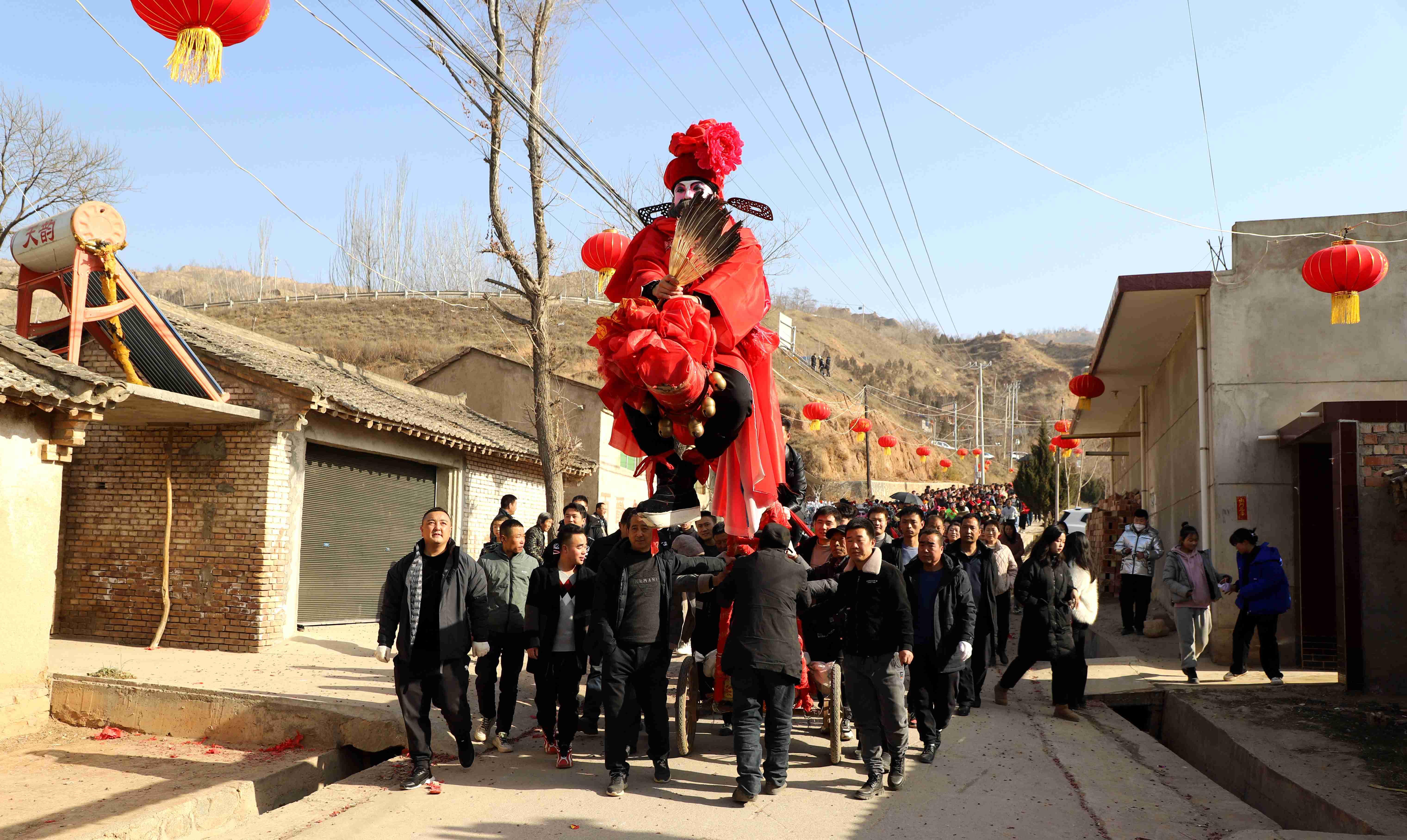 武山县融媒体中心1月30日讯(记者 彭雪 车彤瑶 杨耀斌 王越)“咚咚锵、咚咚锵、咚咚锵咚锵咚锵……”1月29日上午10点,武山县鸳鸯镇锣鼓震天,欢快的鞭炮声敲开了家家户户的门窗,走街串巷的秧歌队绸缎翻飞、舞步整齐、彩扇鲜艳,浓浓年味扑面而来,群众一片欢声笑语。