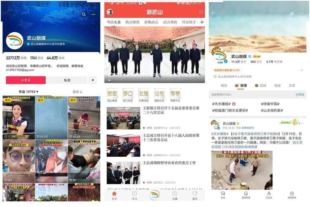 围绕全县大局和县委县政府中心工作,精心组织,突出重点,加大对新冠肺炎防控、复工复产、脱贫攻坚、乡村振兴、作风建设、渭川文化和武山“十有”和党的二十大等工作宣传力度。推出了《疫情防控 我们在行动》《武山“十有”》《渭川文化》《走向乡村振兴》等专题专栏。广播电视、政府网站、新武山、武山发布和武山融媒公众号、武山融媒抖音号、快手号、微博和头条号等平台,联合入驻的新华社、央视频、视听甘肃、新甘肃、新天水等国家和省市级平台不断发力,持续提升“武山融媒”的传播力和影响力,舆论主阵地稳步提升。