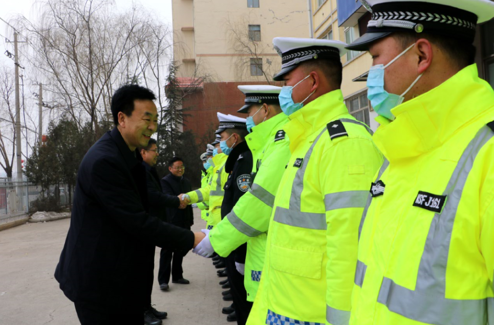 令军强、赵百祥、王想成一行来到县交警大队,看望慰问节日期间坚守岗位的干部职工,向大家致以节日的问候与祝福,对交警大队过去一年来的工作成效给予充分肯定,希望执勤民警、职工和辅警值好班,站好岗,切实做好道路交通安全和治安维稳工作,确保春节期间全县道路交通安全和治安稳定,让全县人民过上一个平安、祥和的新春佳节。