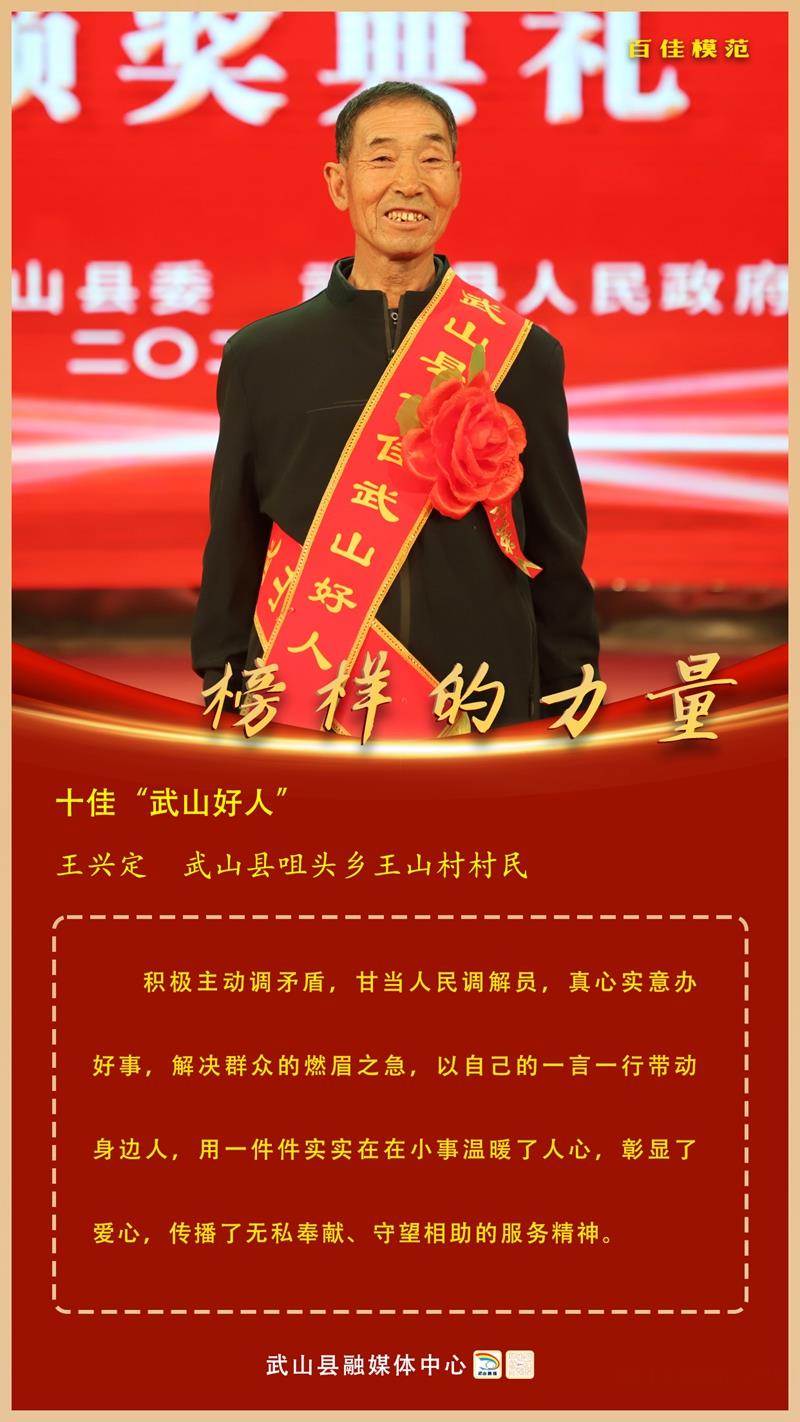 王兴定,武山县咀头乡王山村村民。积极主动调矛盾,甘当人民调解员,真心实意办好事,解决群众的燃眉之急,以自己的一言一行带动身边人,用一件件实实在在小事温暖了人心,彰显了爱心,传播了无私奉献、守望相助的服务精神。