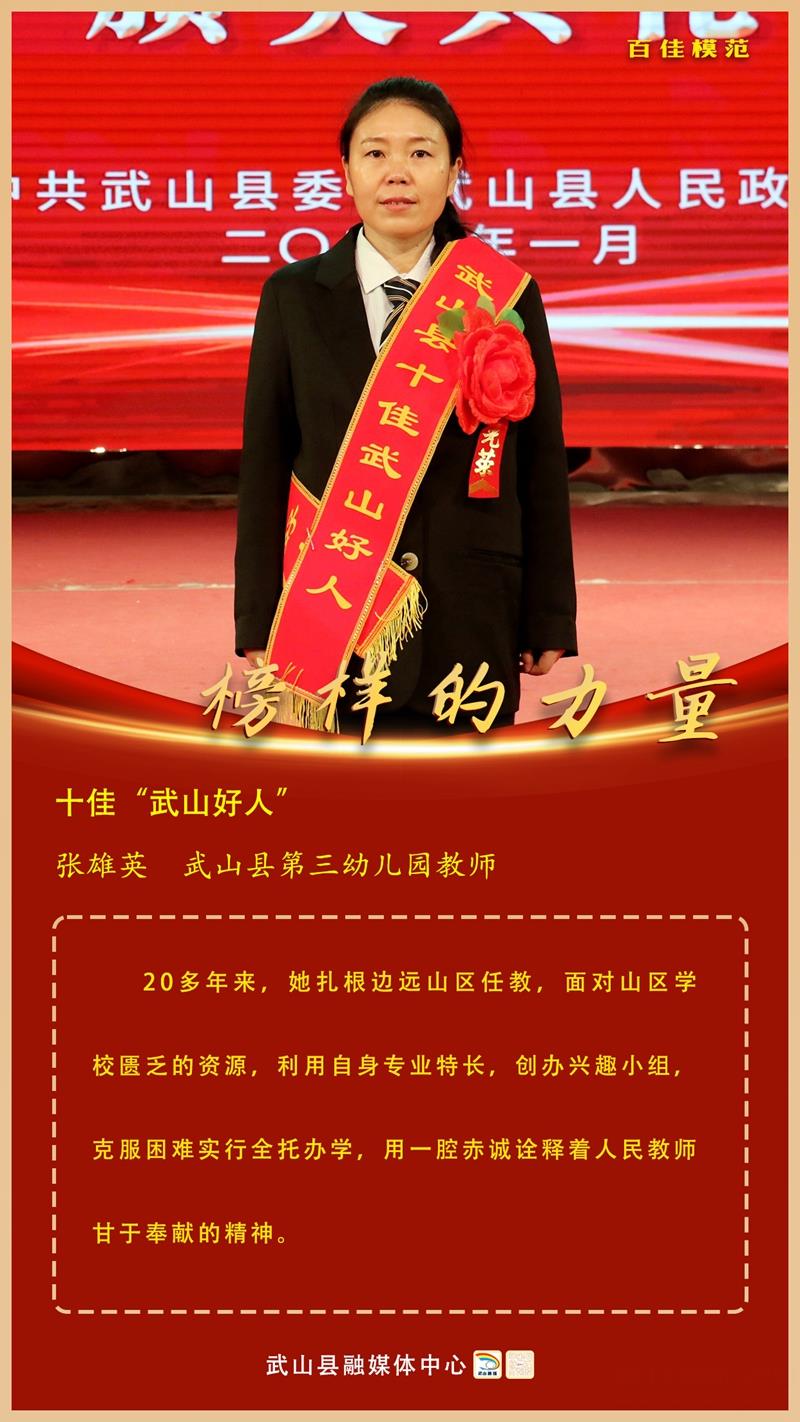 张雄英,武山县第三幼儿园教师。20多年来,她扎根边远山区任教,面对山区学校匮乏的资源,利用自身专业特长,创办兴趣小组,克服困难实行全托办学,用一腔赤诚诠释着人民教师甘于奉献的精神。