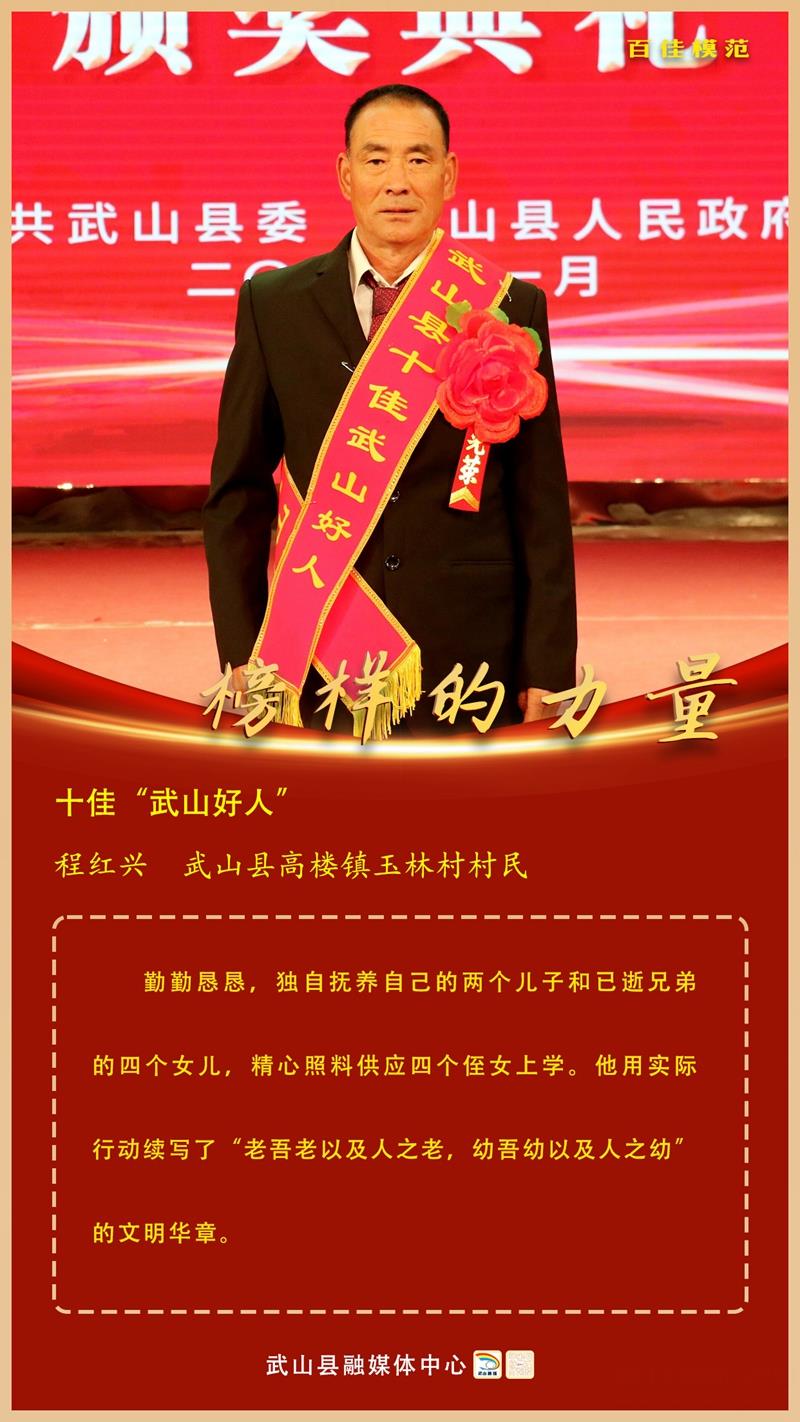 程红兴,武山县高楼镇玉林村村民。 勤勤恳恳,独自抚养自己的两个儿子和已逝兄弟的四个女儿,精心照料供应四个侄女上学。他用实际行动续写了“老吾老以及人之老,幼吾幼以及人之幼”的文明华章。