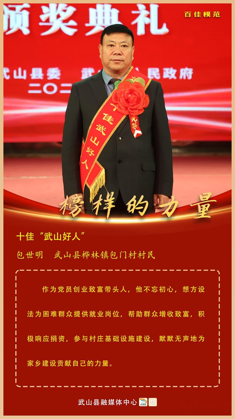 包世明,武山县桦林镇包门村村民。作为党员创业致富带头人,他不忘初心,想方设法为困难群众提供就业岗位,帮助群众增收致富,积极响应捐资,参与村庄基础设施建设,默默无声地为家乡建设贡献自己的力量。