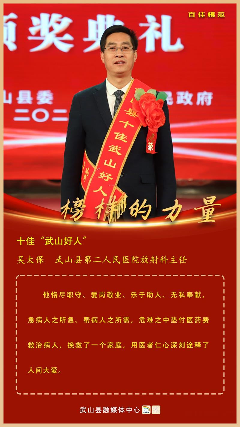 吴太保,武山县第二人民医院放射科主任。他恪尽职守、爱岗敬业、乐于助人、无私奉献,急病人之所急、帮病人之所需,危难之中垫付医药费救治病人,挽救了一个家庭,用医者仁心深刻诠释了人间大爱。