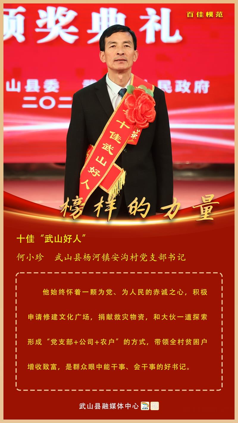 何小珍,武山县杨河镇安沟村党支部书记。他始终怀着一颗为党、为人民的赤诚之心,积极申请修建文化广场,捐献救灾物资,和大伙一道探索形成“党支部+公司+农户”的方式,带领村民增收致富,是群众眼中能干事、会干事的好书记。