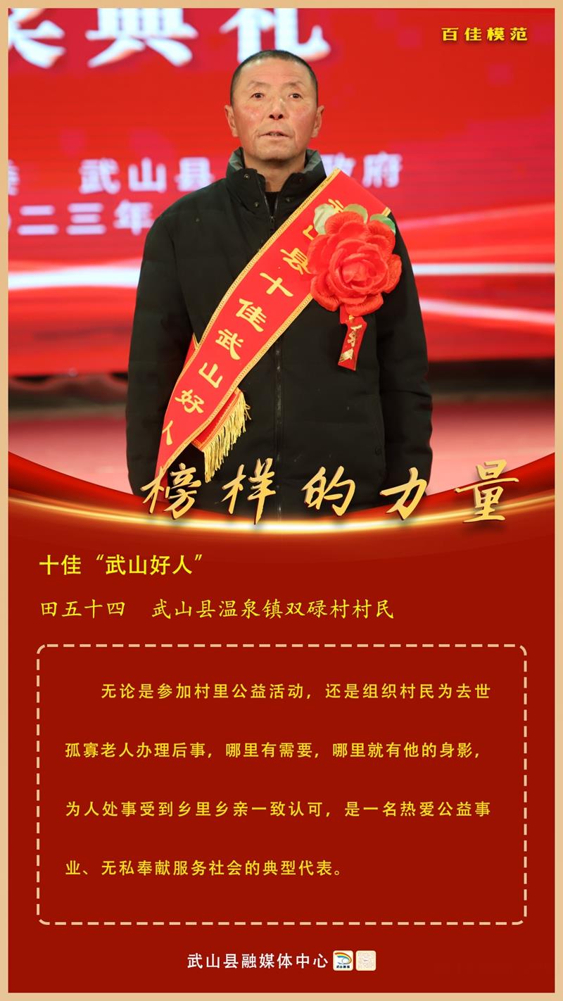 田五十四,武山县温泉镇双碌村村民。无论是参加村里公益活动,还是组织村民为去世孤寡老人办理后事,哪里有需要,哪里就有他的身影,为人处事受到乡里乡亲一致认可,是一名热爱公益事业、无私奉献服务社会的典型代表。