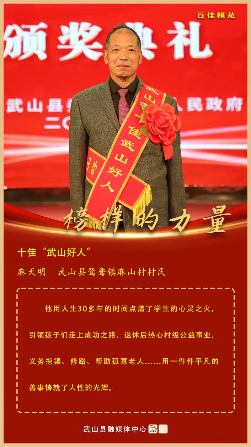 麻天明,武山县鸳鸯镇麻山村村民。他用人生30多年的时间点燃了学生的心灵之火,引领孩子们走上成功之路,退休后热心村级公益事业,义务挖渠、修路、帮助孤寡老人......用一件件平凡的善事铸就了人性的光辉。