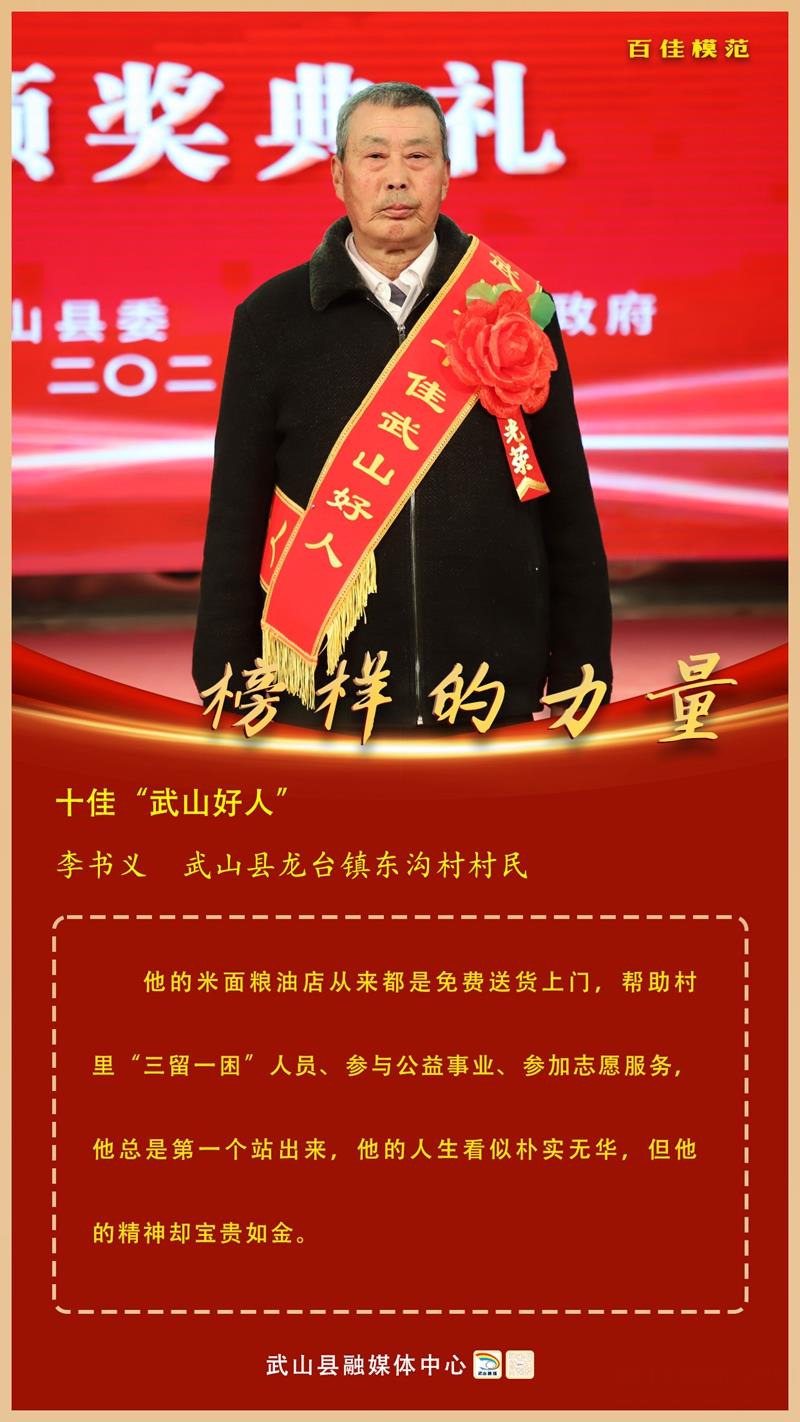 李书义,武山县龙台镇东沟村村民。他的米面粮油店从来都是免费送货上门,帮助村里“三留一困”人员、参与公益事业、参加志愿服务,他总是第一个站出来,他的人生看似朴实无华,但他的精神却宝贵如金。