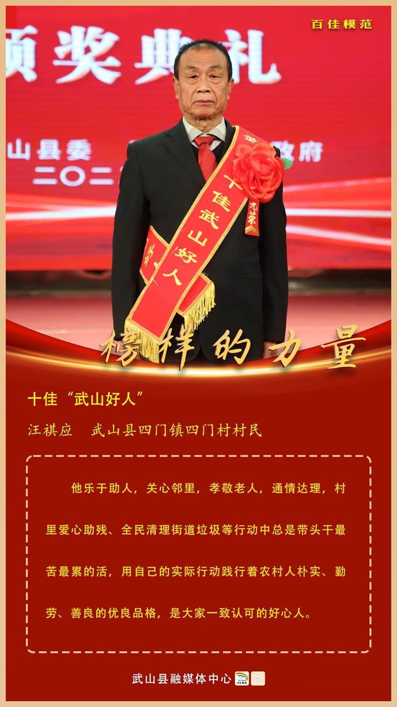 汪祺应,武山县四门镇四门村村民。他乐于助人,关心邻里,孝敬老人,通情达理,村里爱心助残、全民清理街道垃圾等行动中总是带头干最苦最累的活,用自己的实际行动践行着农村人朴实、勤劳、善良的优良品格,是大家一致认可的好心人。